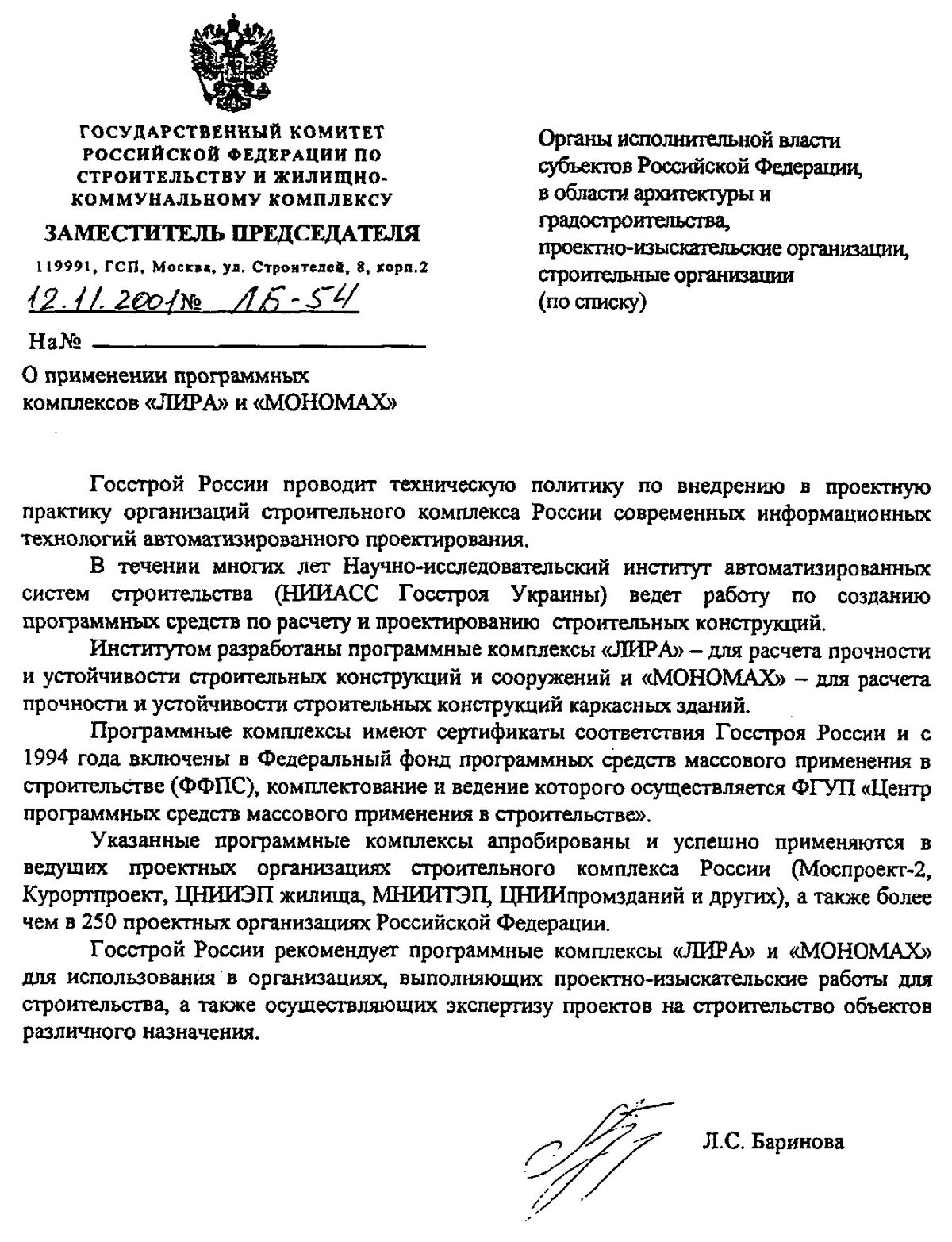 Держбуд Росії рекомендує програмні комплекси Ліра і Мономах для використання в організаціях, що виконують проектно-вишукувальні роботи для будівництва, а також здійснюють експертизу проектів на будівництво об'єктів різного призначення.