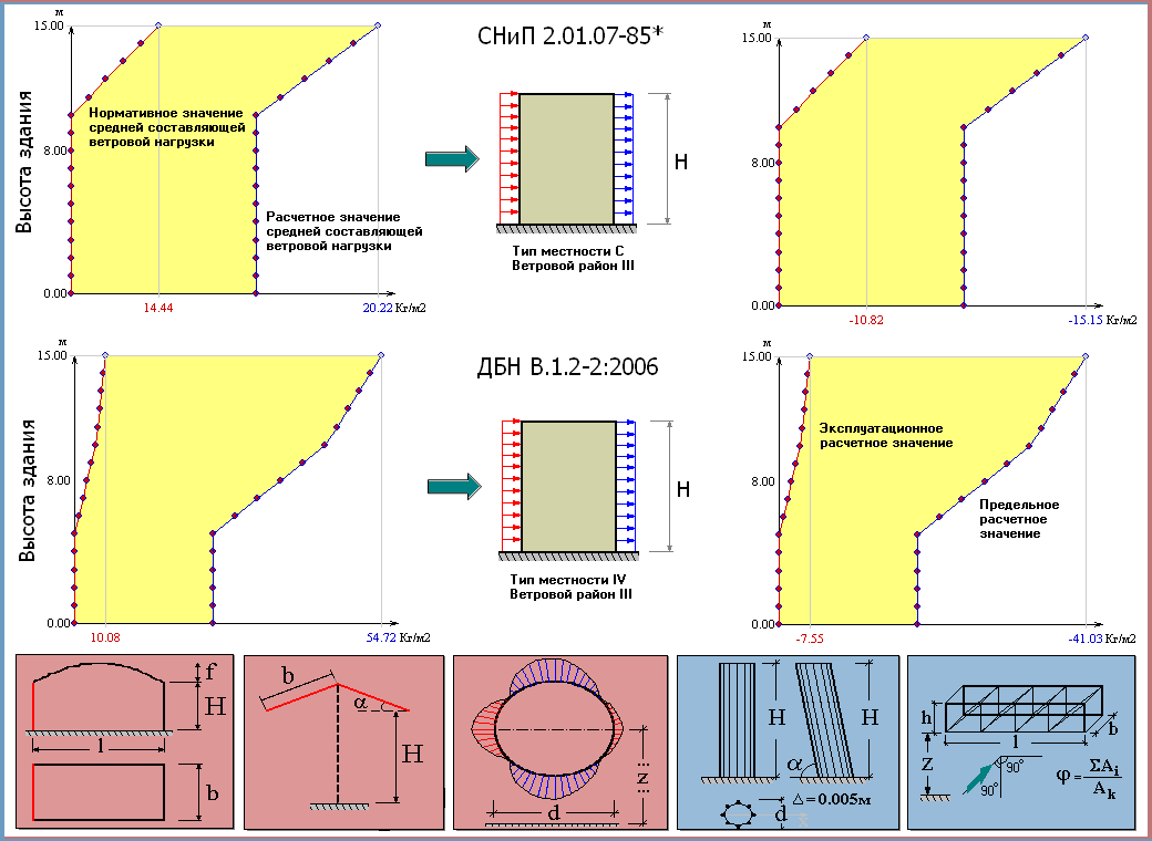 Відповідно до ДБН В.1.2-2:2006 «Навантаження та впливи» обчислюються граничні та експлуатаційні розрахункові значення вітрового навантаження. Аеродинамічний коефіцієнт визначається за схемами Додатка И.