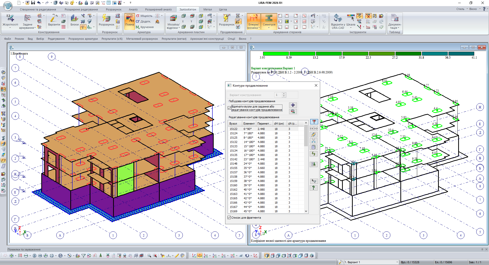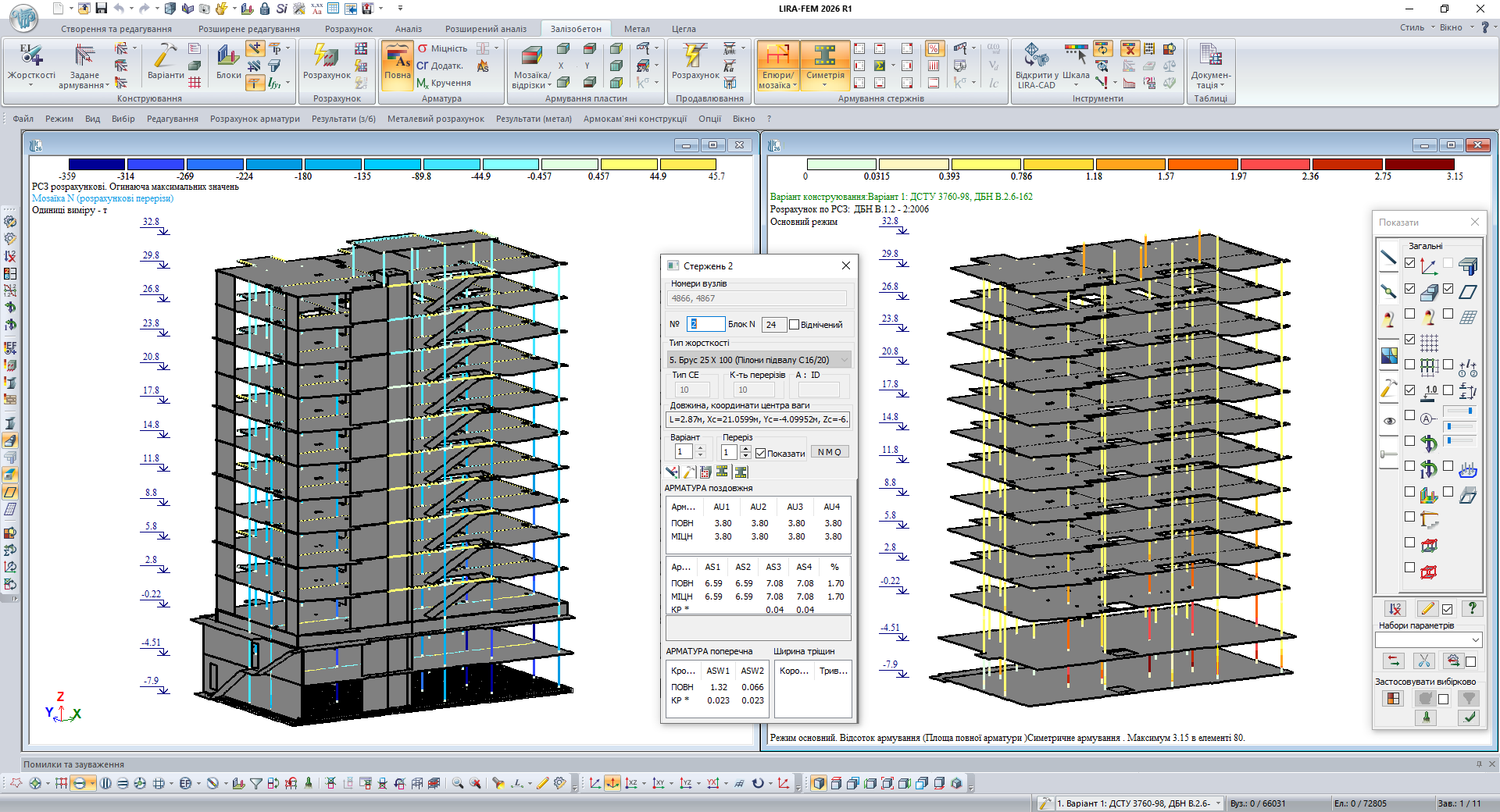 В процесі розрахунку перерізів елементів залізобетонних конструкцій: колон, балок, плит, діафрагм та оболонок виконується підбір площі робочої арматури за граничними станами першої та другої групи відповідно до чинних нормативів. Крім того, виконується перевірка заданого армування в стержнях та пластинах, якими модеюються залізобетонні конструкції.