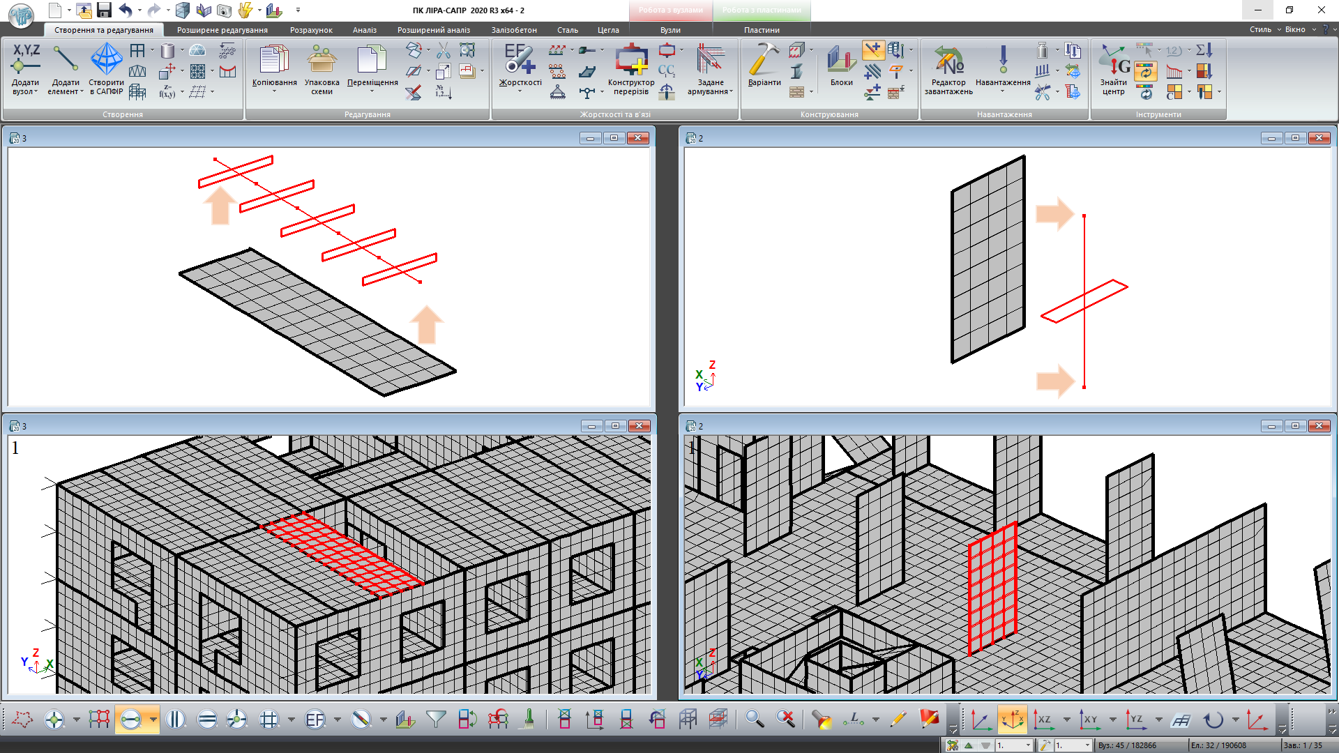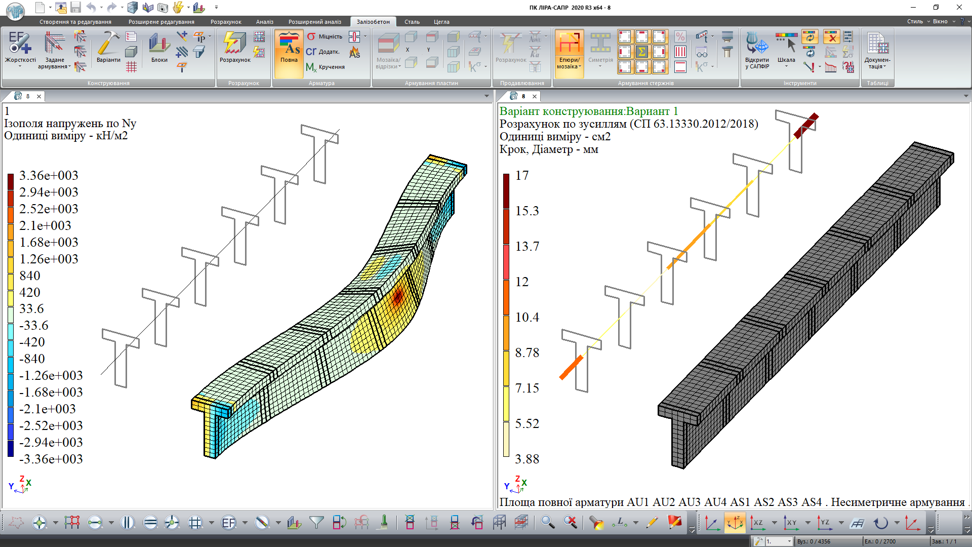 На основі отриманих внутрішніх зусиль у розрахункових перерізах стержневих аналогів можна виконати їх конструювання за допомогою наявних у ПК ЛІРА-САПР систем конструювання – підбір армування та/або перевірку заданого армування в залізобетонних та сталезалізобетонних елементах, перевірку та підбір поперечних перерізів сталевих елементів.
