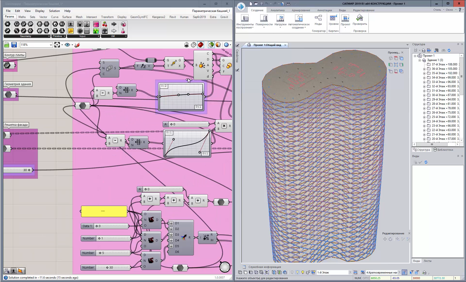Плагін дозволяє Rhino/Grasshopper та САПФІР безпосередньо взаємодіяти для створення та управління моделлю BIM через інтерфейс візуального програмування Grasshopper. Асоціативний характер зв'язку дозволяє створювати робочі проекти різної складності. Змінюючи алгоритм Grasshopper динамічно змінюється модель в САПФІР, а відповідно разом з нею і розрахункова схема.