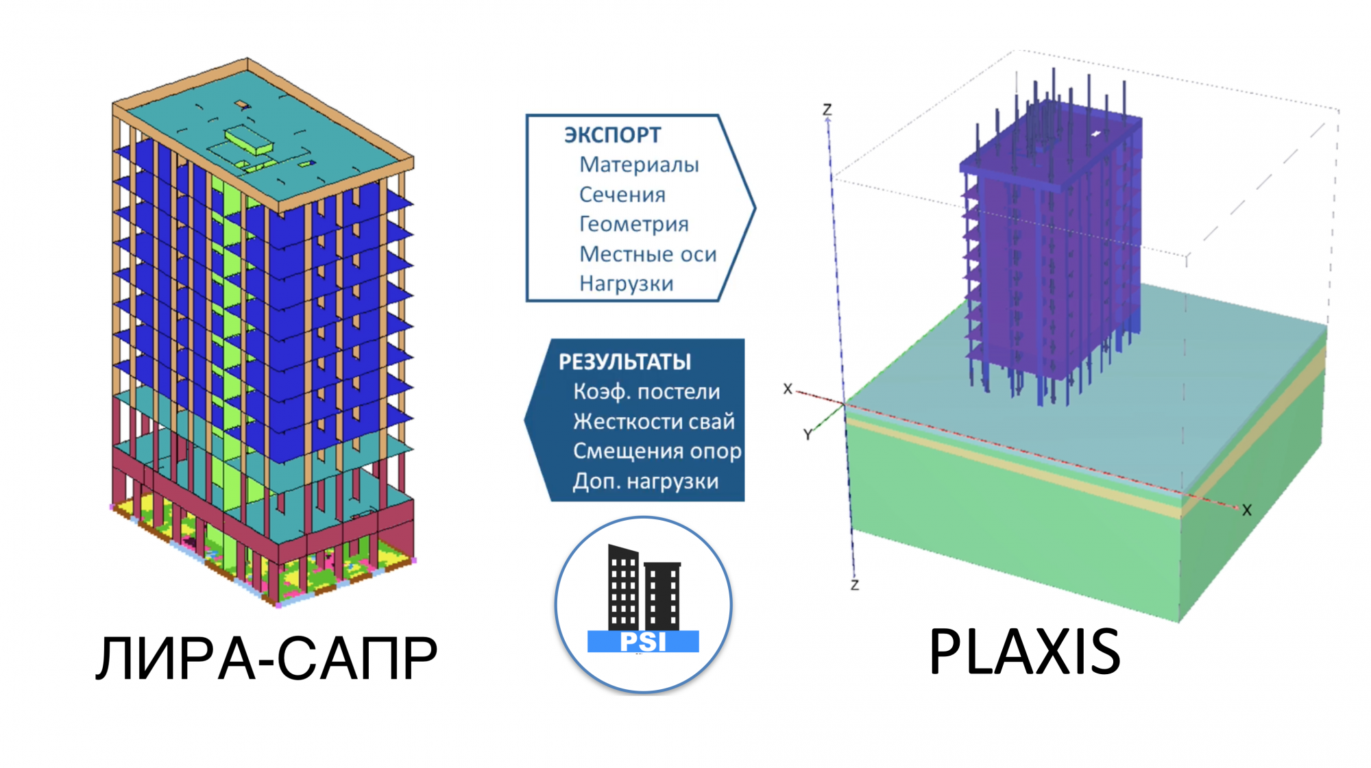 Взаємодія з Plaxis через IFC і DXF файл; Взаємодія ЛІРА-САПР із Plaxis через PSI (Plaxis Structure Interaction); Формування розрахункової моделі з IFC файлу; Передача моделі у ВІЗОР-САПР та розрахунок; Створення моделі ґрунту в Plaxis; Робота з PSI; Результати у програмі Output; Імпорт файлу з Output у ВІЗОР-САПР; Порівняння С1, С2 та передача з файлу в файл; Приклади реальних об'єктів