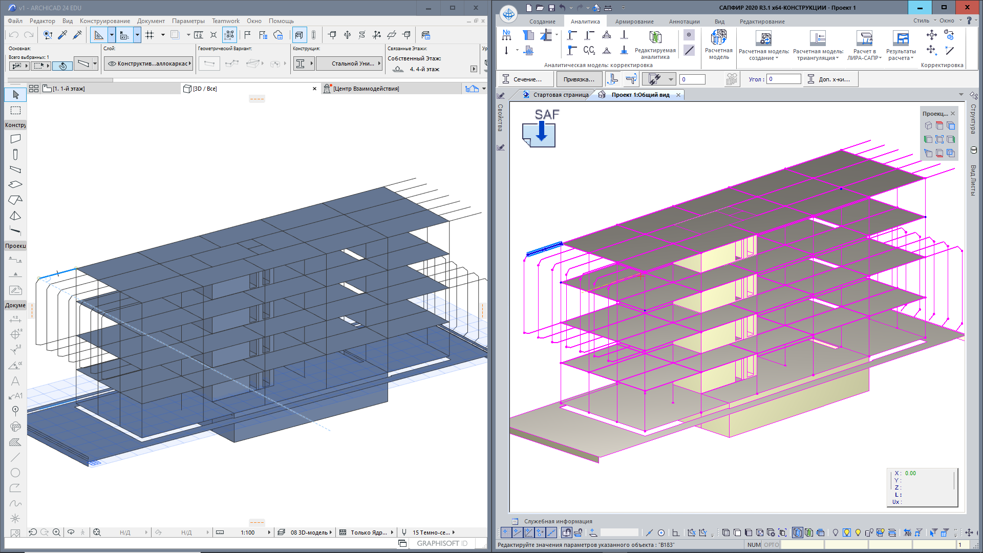 Технологічна зв'язка, що складається з імпорту SAF та IFC файлів з Archiсad у САПФІР. Настройки аналитической модели в Archicad, налаштування зіставлення матеріалів та профілів, які призначені в Archicad до матеріалів та перерізів, що використовуються у САПФІР, використання ексцентриситетів для балок. Крім несучого каркасу, який передається через SAF формат, через IFC файл можна передати інформацію для навантажень у САПФІР (внутрішні перегородки, зовнішні огорожі та приміщення).