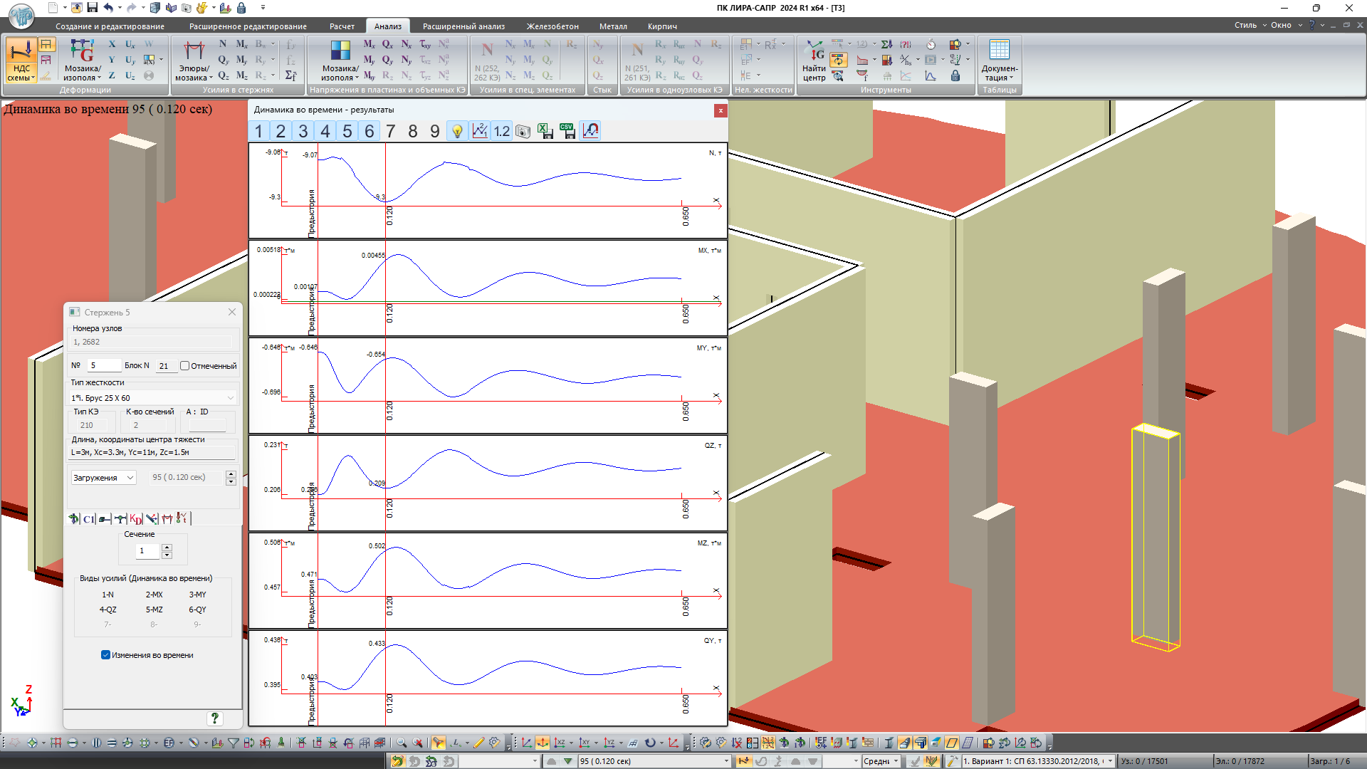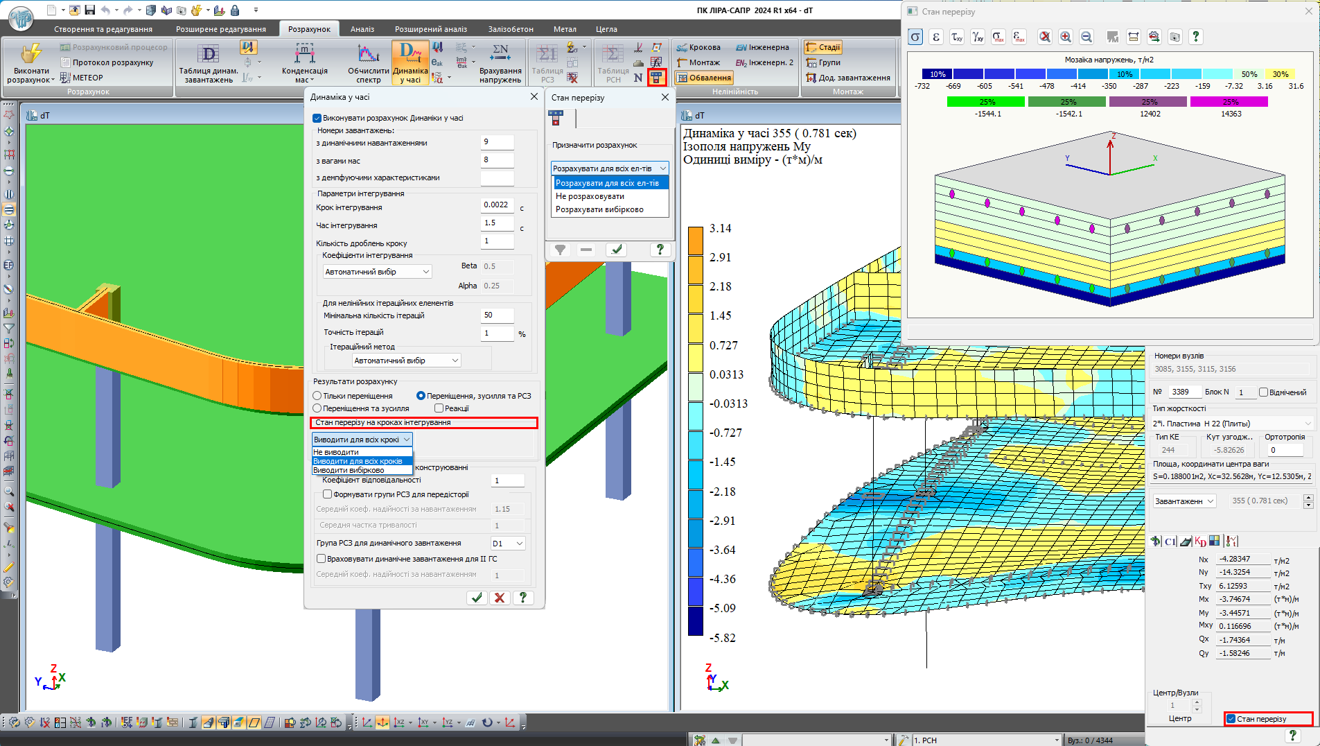 Для фізично нелінійного розрахунку на динаміку в часі можна переглянути в кожний момент часу інтегрування стан перерізу.