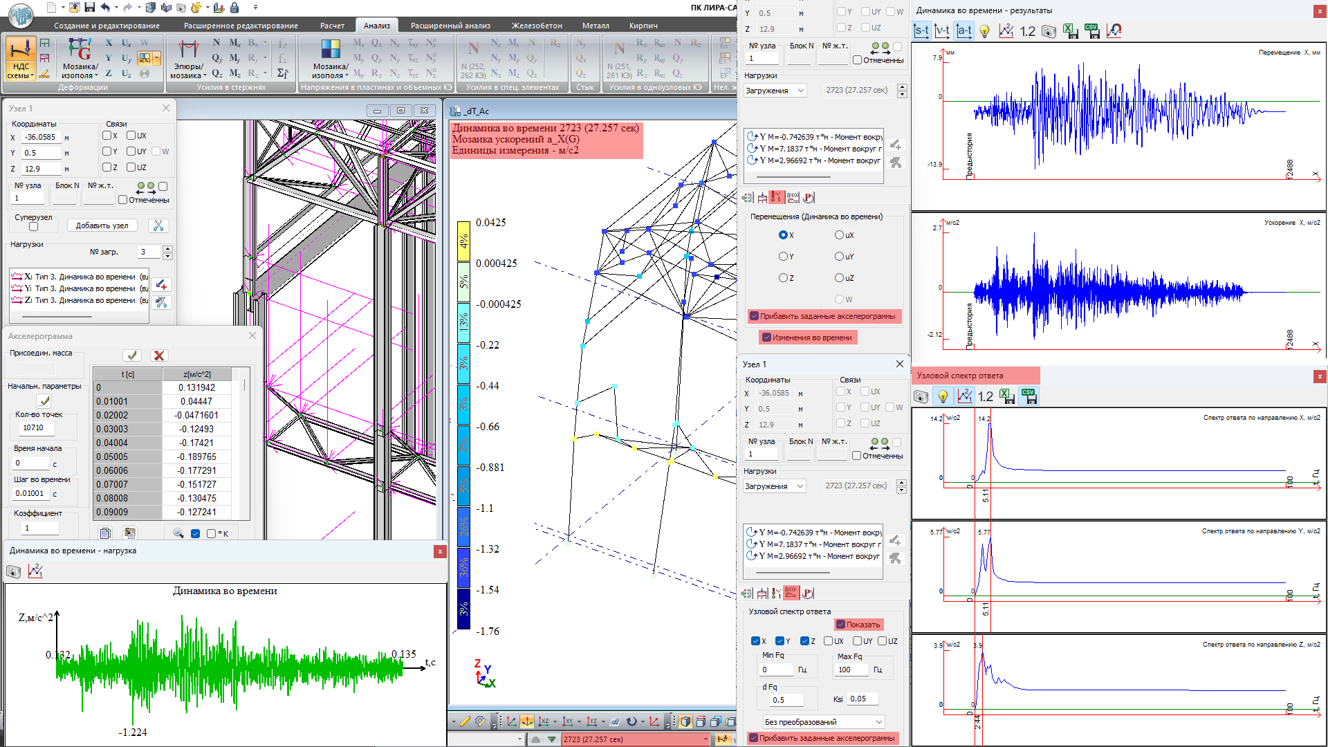 Переміщення (амплітуди), швидкості, прискорення можна відобразити за допомогою мозаїк для всіх вузлів схеми для кожного моменту часу. Крім цього, для кожного вузла схеми можна виконати побудову графіків зміни амплітуди, прискорень, швидкостей у часі. На основі графіку прискорень будується графік спектрів.