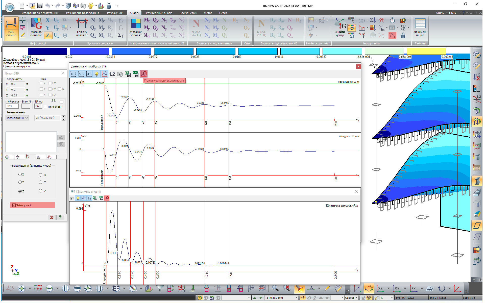 Отже після розрахунку ми маємо результати НДС для кожного моменту часу. Що дозволяє побудувати анімації поведінки конструкцій при динамічному впливі.
