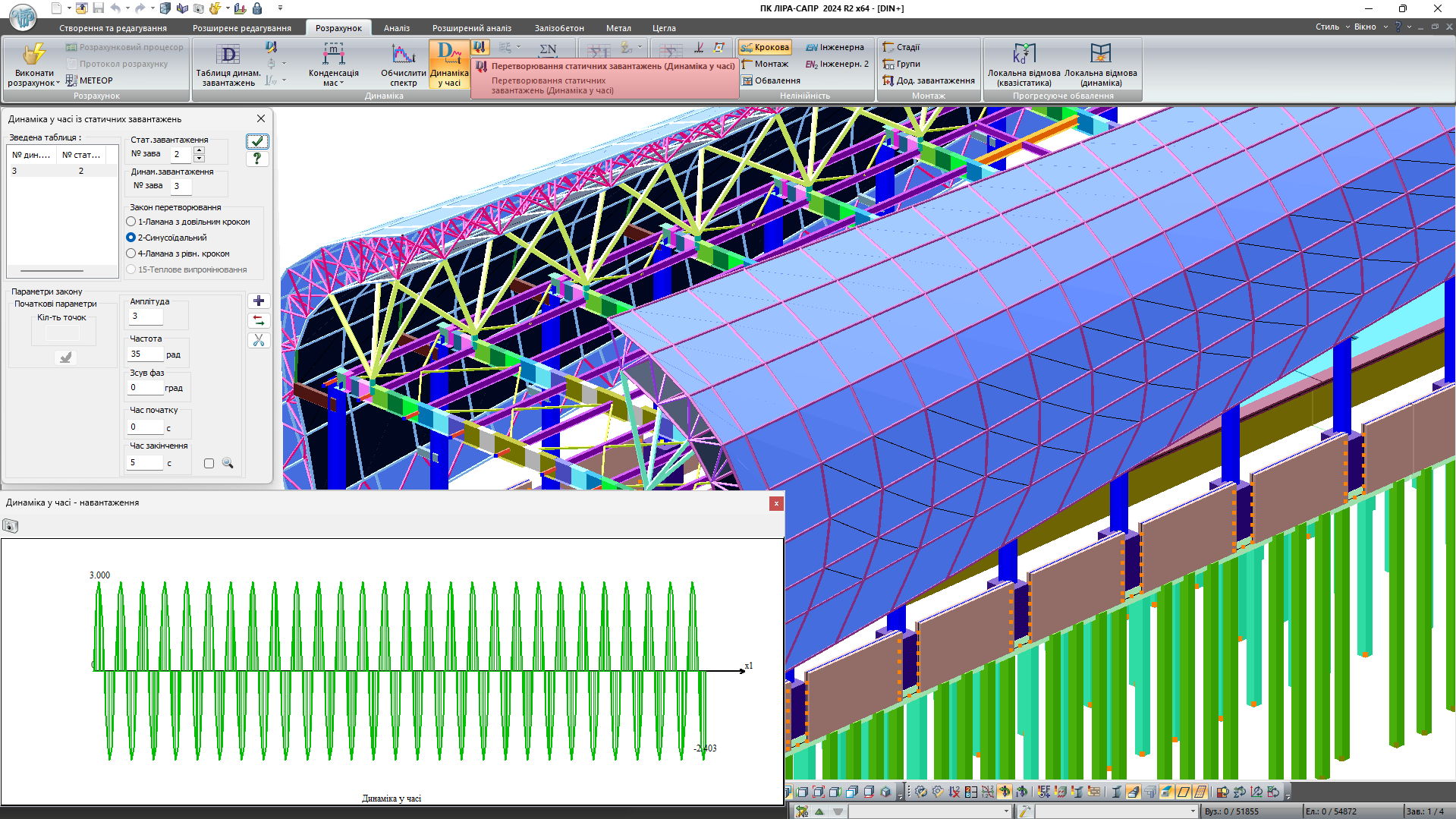 Реалізовано можливість перетворення вузлового статичного навантаження у вузлове динамічне навантаження відповідно до заданого закону перетворення (ламана з довільним кроком; синусоїдальний; ламана з рівномірним кроком).