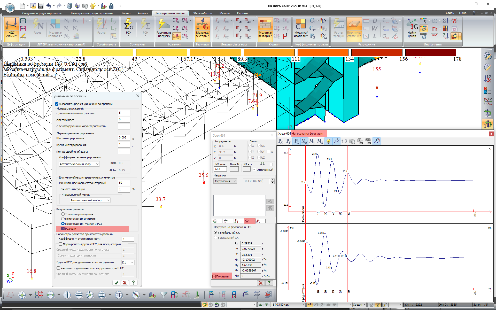 Виведення вузлових реакцій для задач “Динаміки в часі” дозволяє виконувати розрахунок навантажень на фрагмент, розрахунок на продавлювання, розрахунок стержневих аналогів, розрахунок реакцій у простінках, що змінюються у часі, з вибором небезпечних комбінацій (моментів часу) для конструктивного розрахунку.