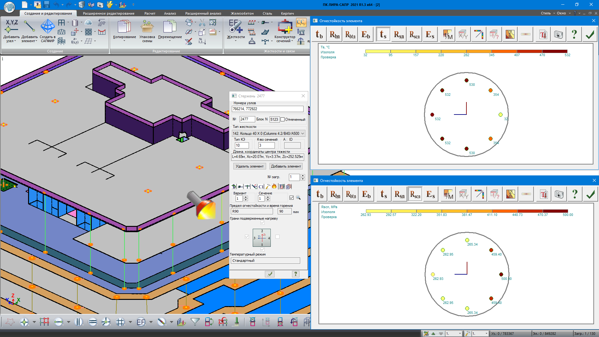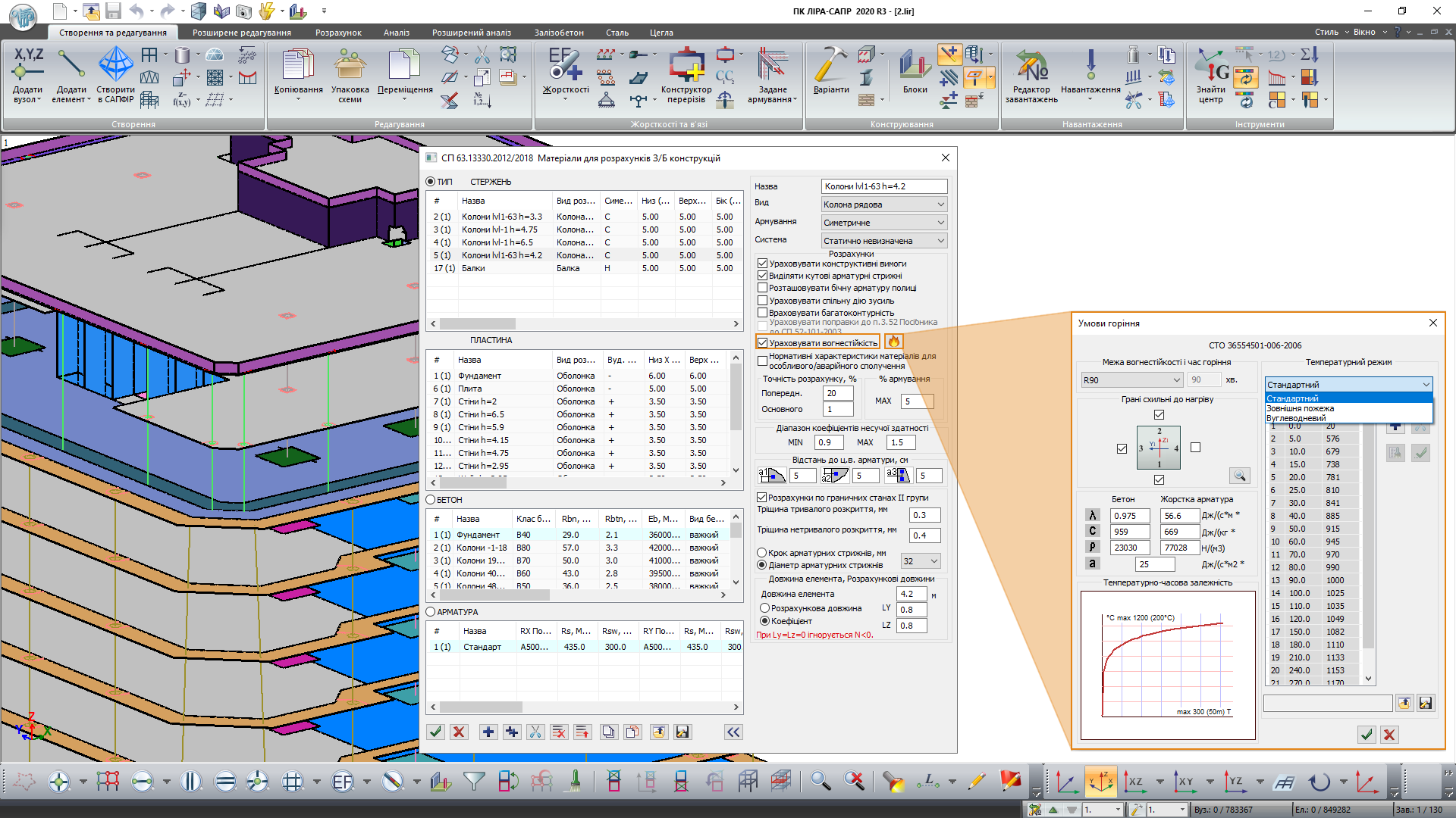 Розрахунок межі вогнестійкості залізобетонних та сталезалізобетонних конструкцій в ПК ”ЛІРА-САПР” зводиться до обчислення розподілу температур по перерізу відповідно до заданого періоду часу в умовах пожежі; подальшим коригуванням фізико-механічних характеристик матеріалів на основі отриманих температурних полів; перевірці несучої здатності елементів конструкції на дію нормативного навантаження і у разі невиконання вимог – нарощування армування.