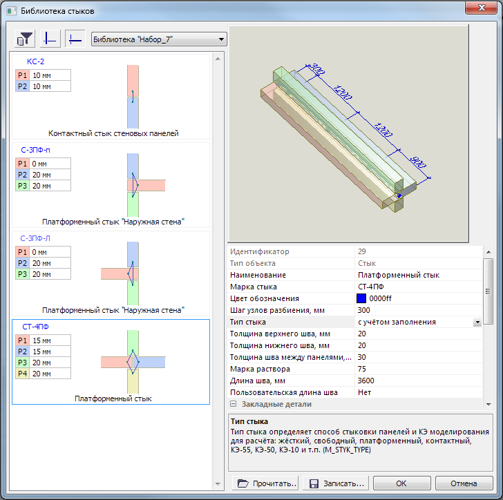 Бібліотека включає різні варіанти таких типів стиків як платформний стик, контактний стик, вертикальні стики стінових панелей із закладними деталями та без них та ін. На основі вибраного типу користувач складає конкретні екземпляри стиків і встановлює їх у модель будівлі.