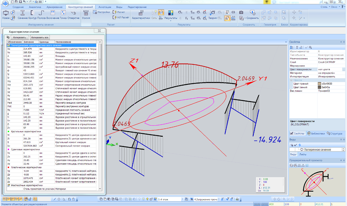 Комбінація цих засобів дозволяє формувати складні перерізи як набір контурів різного обрису, тонких смуг, а також точкових та арматурних включень. Допускається формування отворів різної форми. При формуванні перерізів довільної форми використовуються булеві операції.