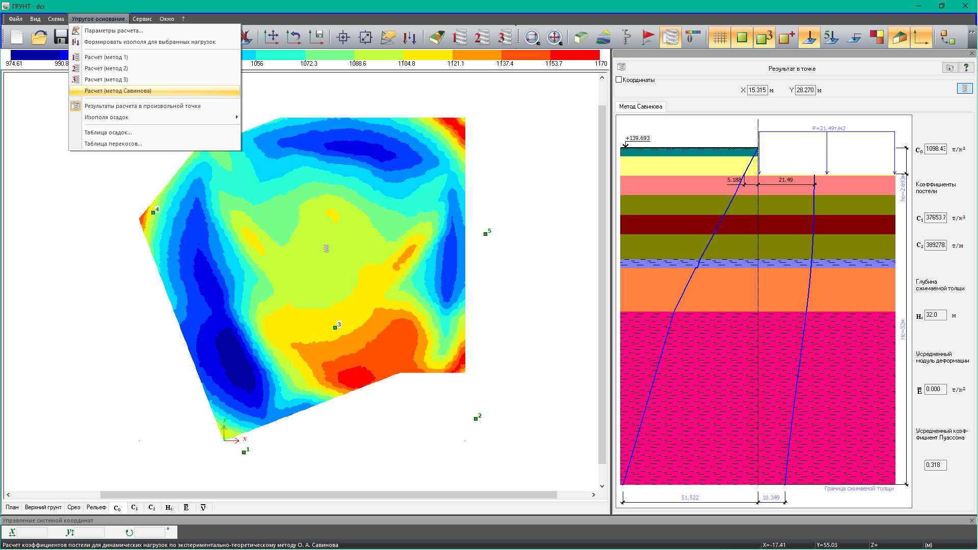 Користувач має можливість переглянути розташування шарів у довільних вертикальних та горизонтальних зрізах ґрунтового масиву, а також картину ізополів коефіцієнтів постелі С1 та С2.
