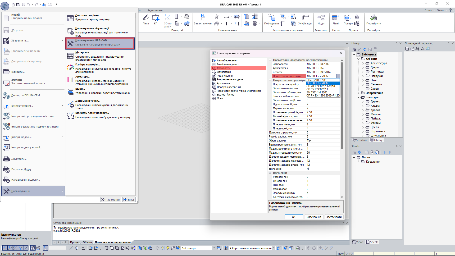 Роботу з програмою LIRA-CAD (САПФІР) (препроцесор LIRA-FEM) або з ВІЗОР (МCЕ-редактор LIRA-FEM) рекомендуємо починати з налаштувань стандартів, що застосовуються, тобто, з нормативних документів, що використовуються за умовчанням. Таким чином, види та підвиди завантажень, а також коефіцієнти та правила їх сполучення в розрахунках одразу будуть налаштовані відповідно до прийнятих нормативних документів.