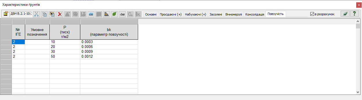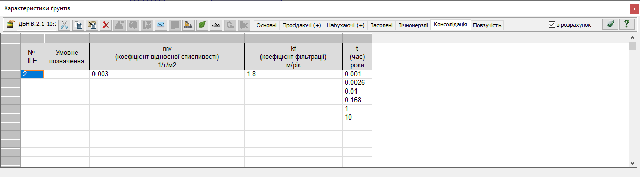 Характеристики ґрунтів (основні, специфічні, консолідація та повзучість) задаються в діалоговому вікні Характеристики ґрунтів системи ГРУНТ. Деформації від специфічних ґрунтів враховуються в межах стисливої товщі.