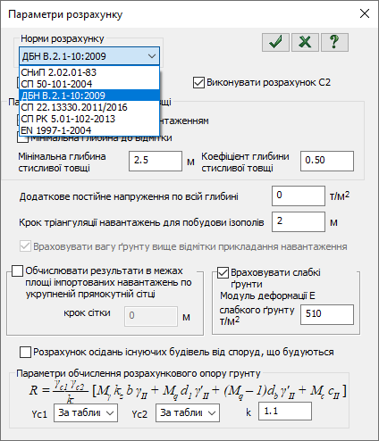 Розрахунок на повне осідання виконується локально в системі ГРУНТ або в процесі повного розрахунку конструкції при обчислення коефіцієнтів пружності основи (коефіцієнтів постелі) С1 и С2.