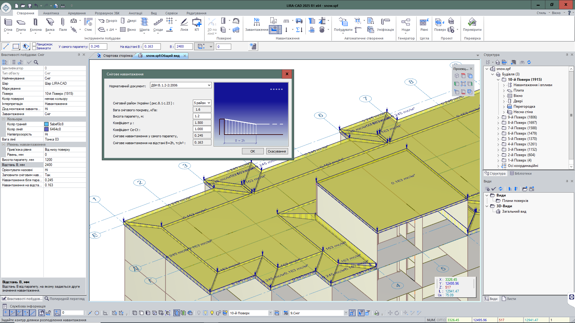 В LIRA-CAD реалізована можливість автоматичного завдання снігових, вітрових, ожеледних навантажень та ожеледно-вітрових навантажень відповідно до ДБН В.1.2-2:2006 "Навантаження і впливи. Норми проектування".
