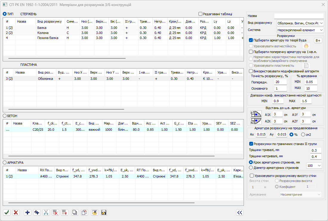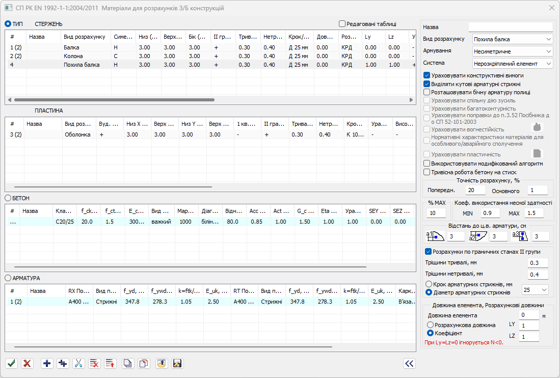 Для підбору арматури відповідно до вимог Єврокод 2 (EN 1992-1-1:2004, ІDT), Єврокод 2 (Білорусь) (ТПК EN 1992-1-1:2009*), Єврокод 2 (Казахстан) (СП РК EN 1992-1 -1:2004/2011) у стержневих елементах задаються загальні характеристики матеріалів. Зі списку вибирається вид розрахунку: стержень, балка, колона, пілон або похила балка.