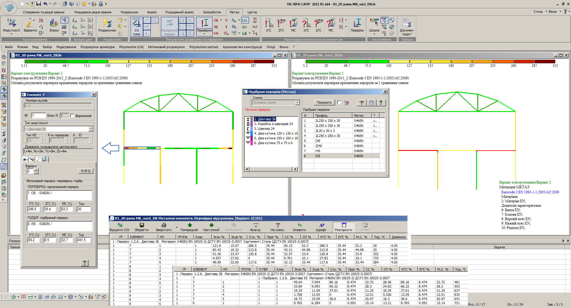 Результат перевірки сталевих перерізів: відсотки вичерпання несучої здатності, отримані при відповідних перевірках по Eurocode 3, представлені у вигляді таблиць для різних типів елементів (балка, колона, ферма, універсальний елемент), а також у вигляді мозаїк значень на розрахунковій схемі у перерізах та для елементів у цілому. Результат підбору перерізів: підбір профілів із зазначених сортаментів за умови забезпечення несучої здатності за вказаними перевірками у контрольній перевірці підібраних перерізів.