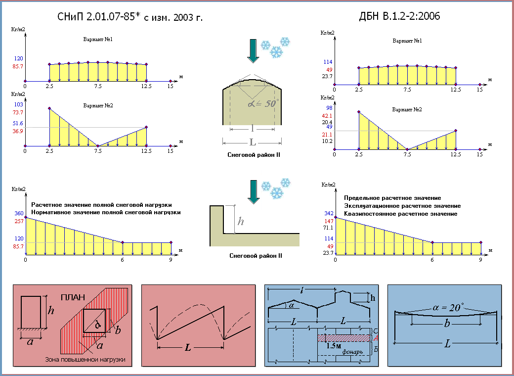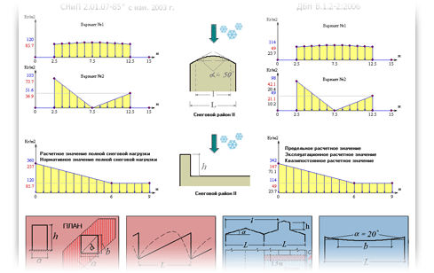 Відповідно до СНиП 2.01.07-85* «Навантаження та впливи» обчислюються нормативні та розрахункові значення повного снігового навантаження на горизонтальну проекцію покриття за схемами таблиці 3 Додатка 3.