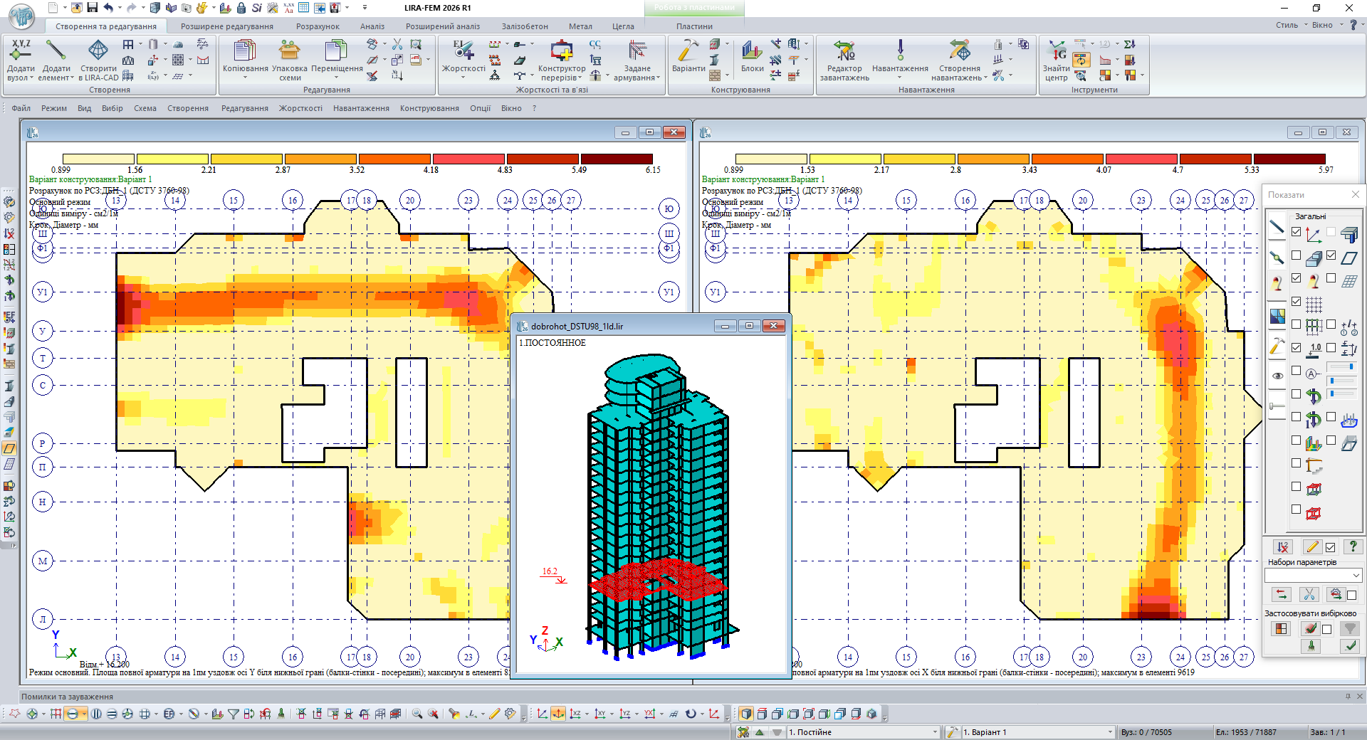 В процесі розрахунку перерізів елементів залізобетонних конструкцій: колон, балок, плит, діафрагм та оболонок виконується підбір площі робочої арматури за граничними станами першої та другої групи відповідно до чинних нормативів. Крім того, виконується перевірка заданого армування в стержнях та пластинах, якими модеюються залізобетонні конструкції.