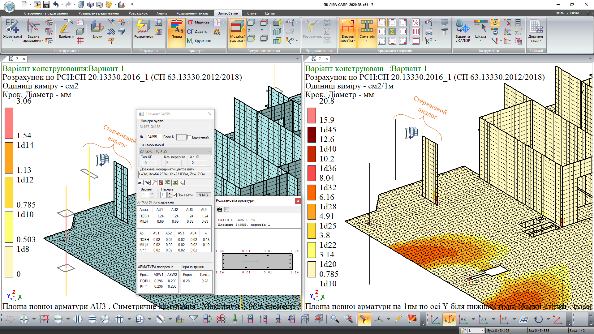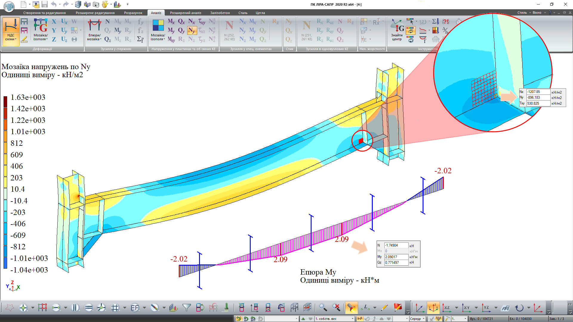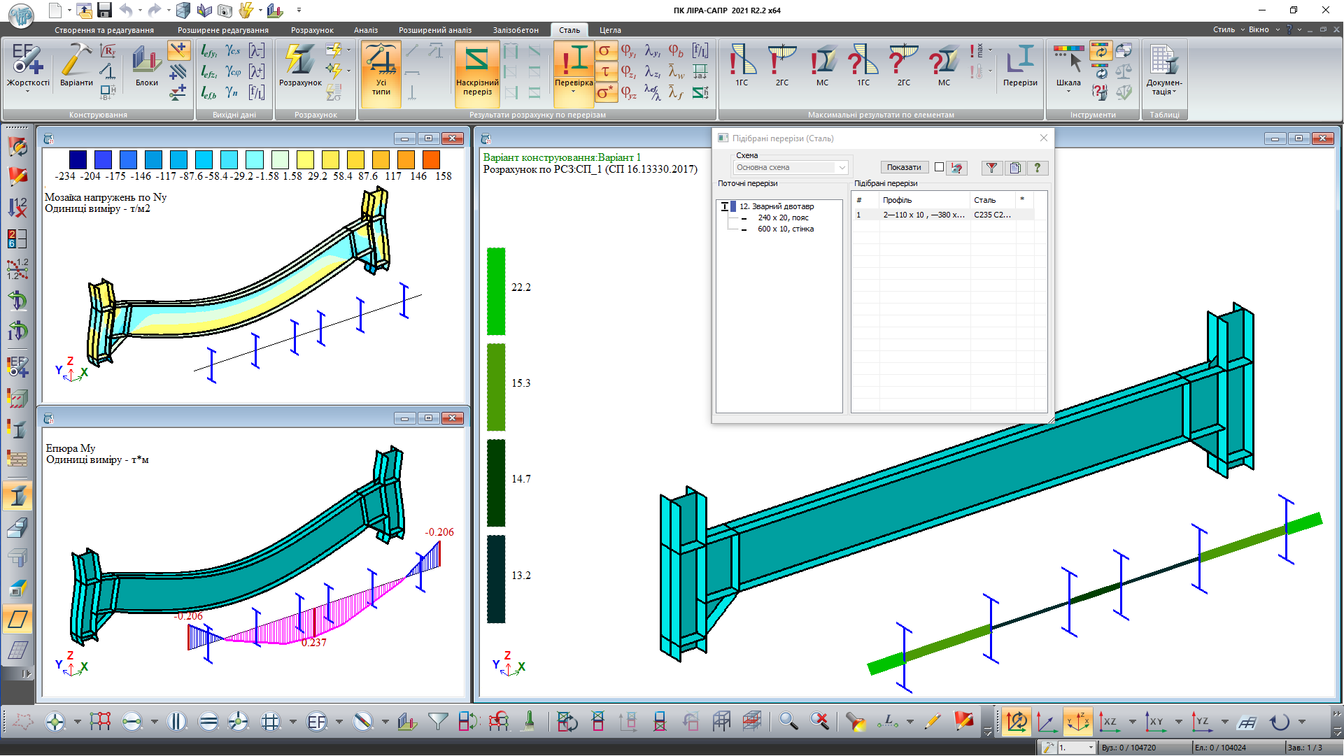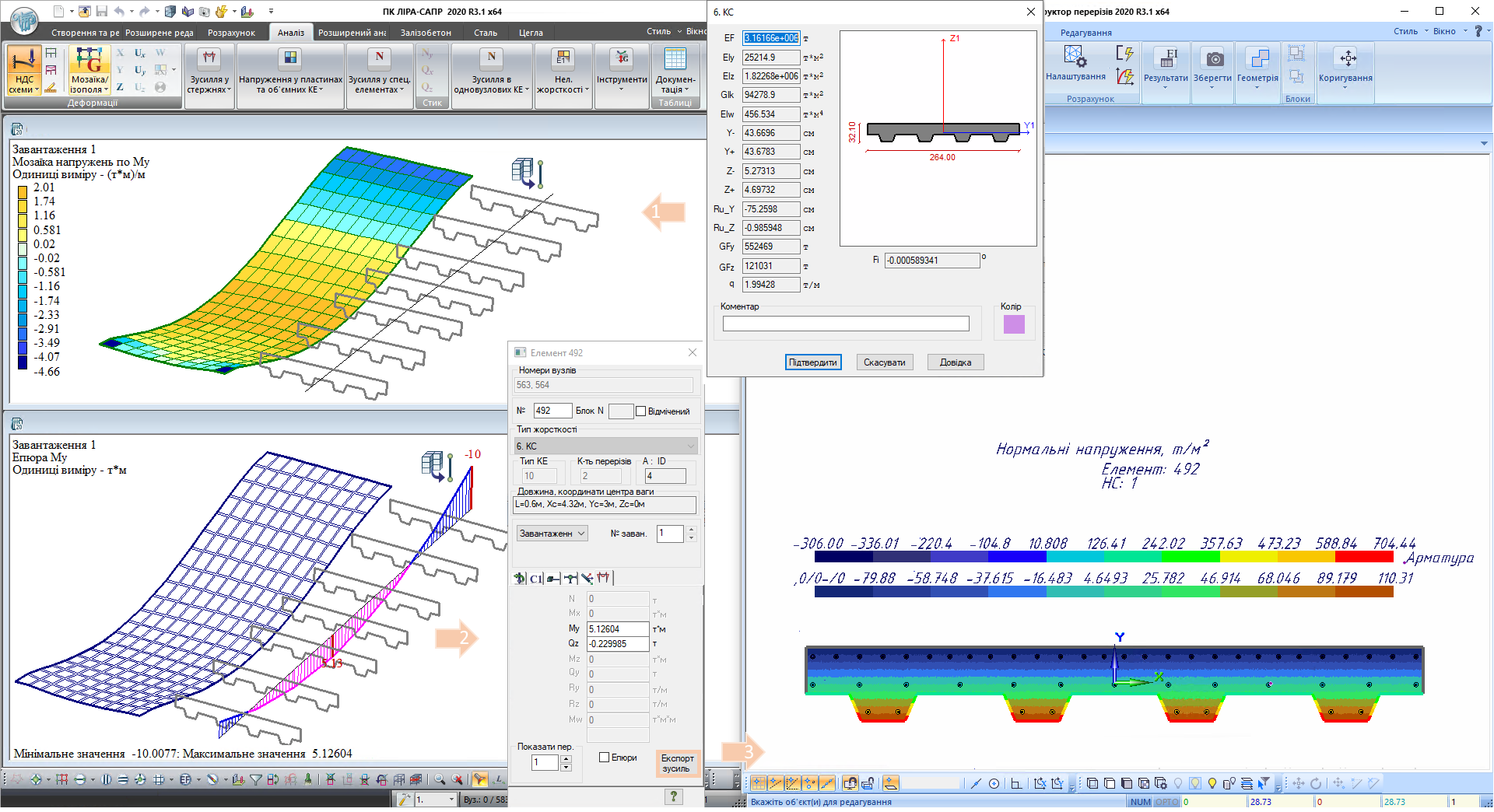 На основі отриманих внутрішніх зусиль у розрахункових перерізах стержневих аналогів можна виконати їх конструювання за допомогою наявних у ПК ЛІРА-САПР систем конструювання – підбір армування та/або перевірку заданого армування в залізобетонних та сталезалізобетонних елементах, перевірку та підбір поперечних перерізів сталевих елементів.