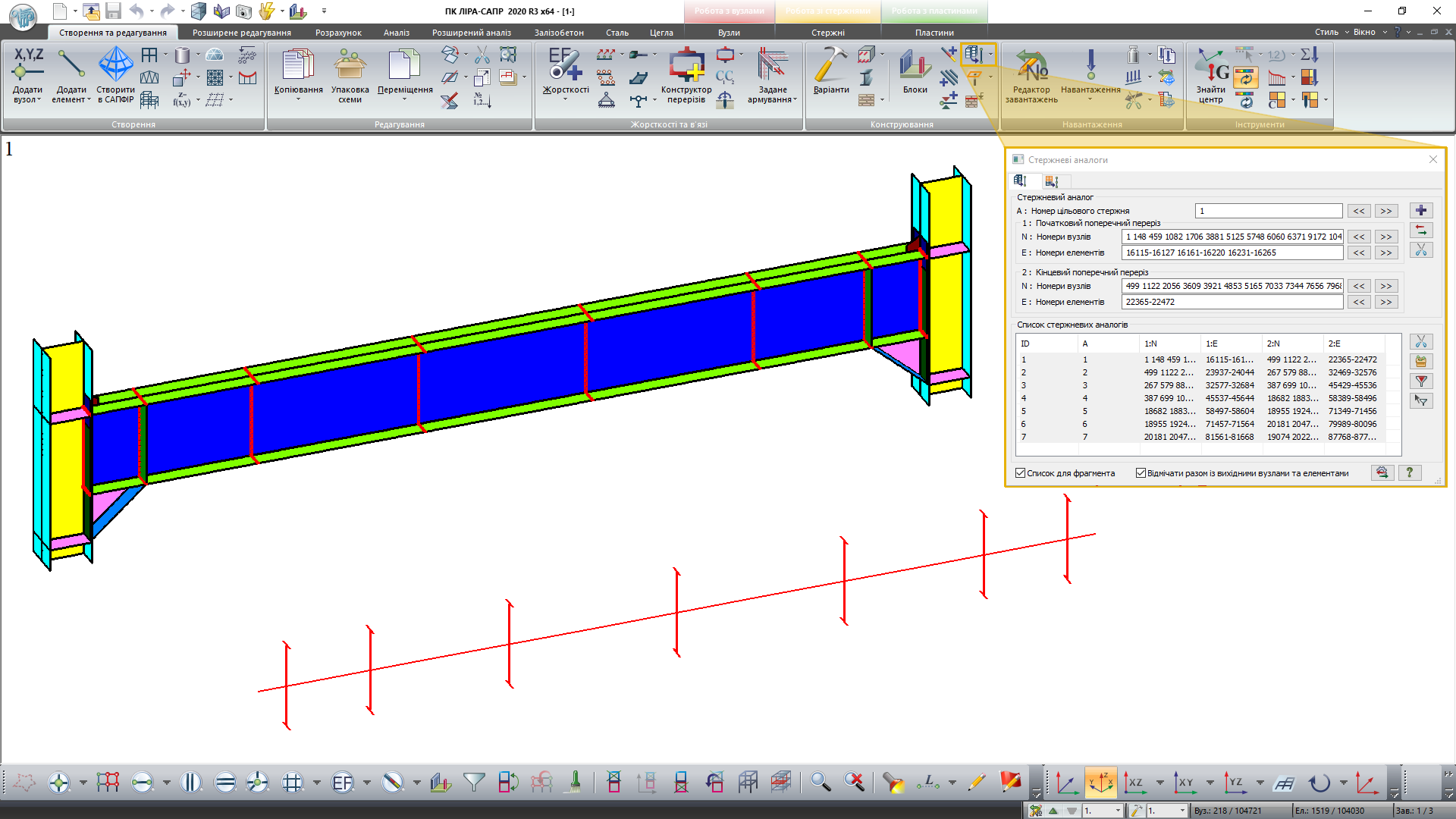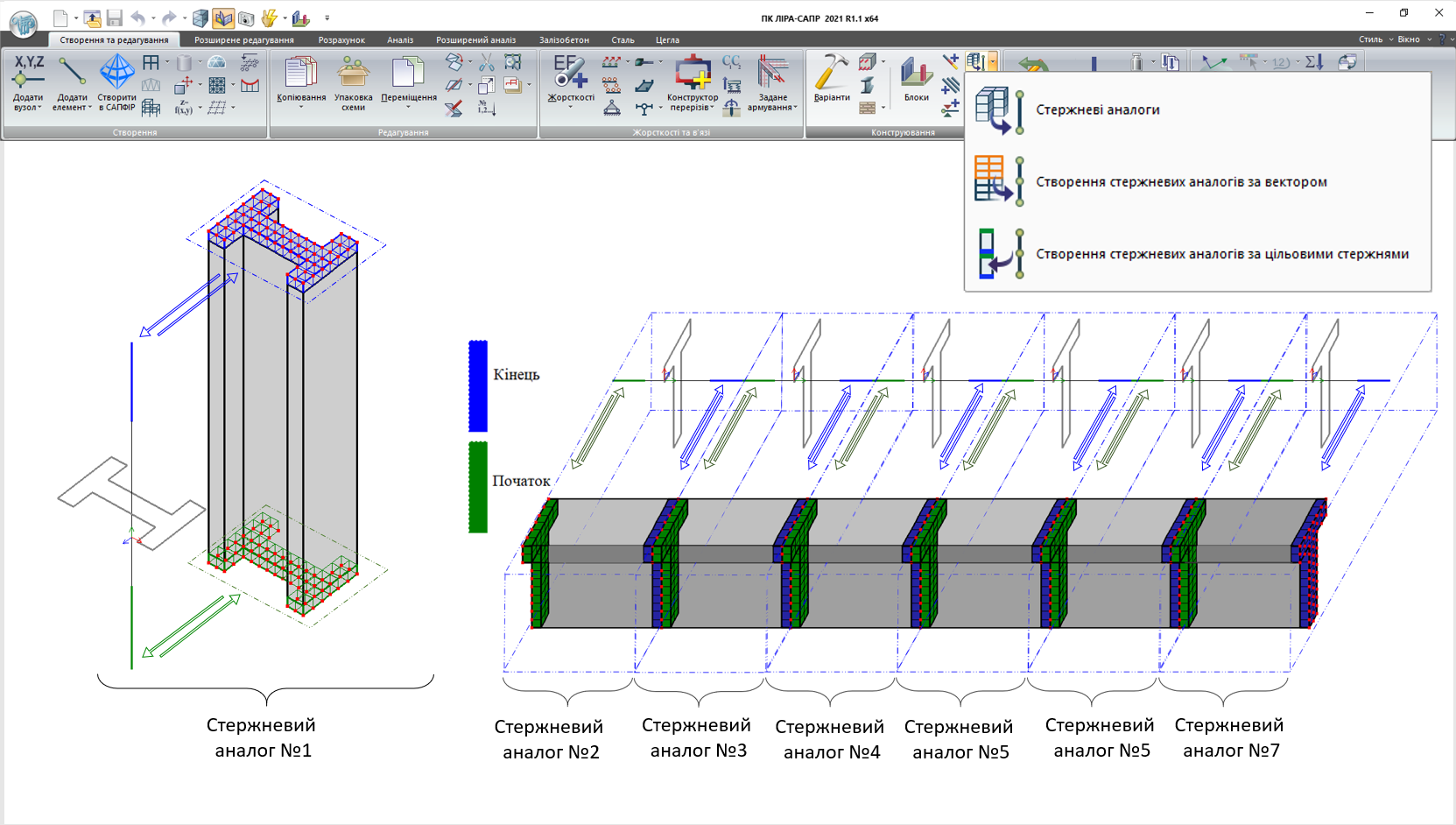 Реалізовано автоматизований спосіб створення стержневих аналогів (по створених уздовж заданого вектора цільових стержнях; по вказаних цільових стержнях). Якщо вихідні елементи СА змодельовані з пластин, то можна додатково виконати розпізнавання форми та розмірів поперечних перерізів. Переріз цільового стержня СА в залежності від форми складеного перерізу набору вихідних об'єктів призначається прямокутним, тавровим, тавровим несиметричним, двотавровим, хрестовим або кутовим. Розміри перерізу визначаються по габаритним розмірам відповідного набору елементів-пластин та товщинам пластин.