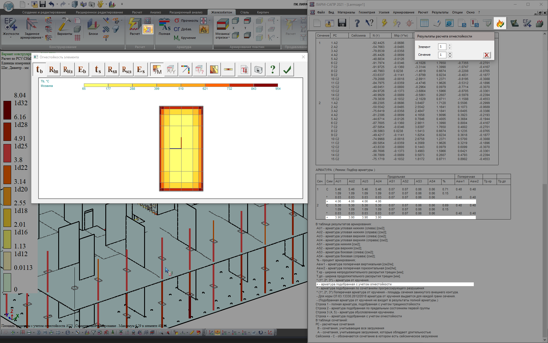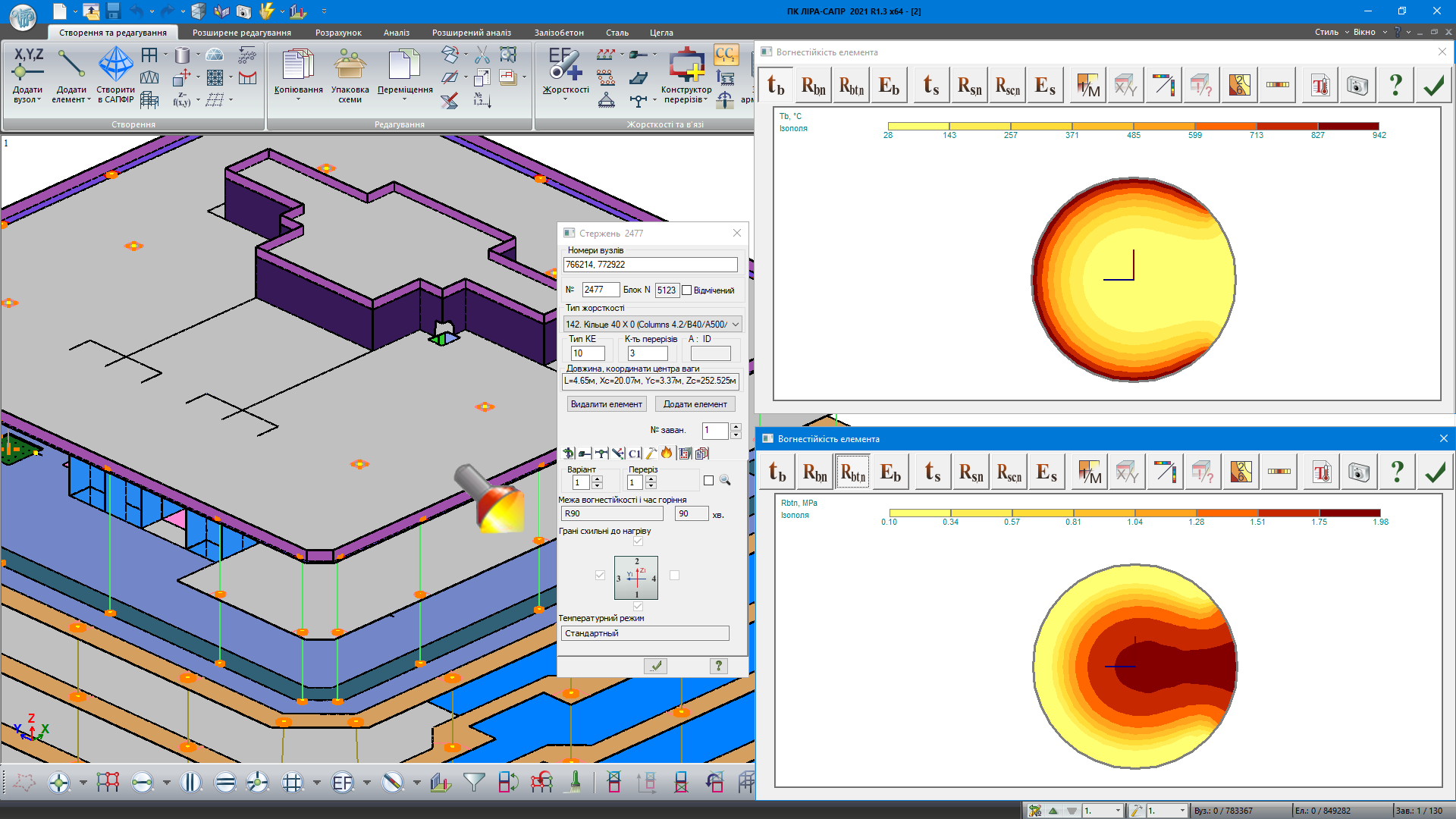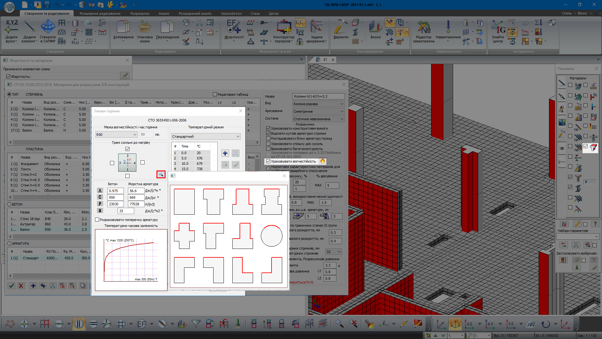 Розрахунок межі вогнестійкості залізобетонних та сталезалізобетонних конструкцій в ПК ”ЛІРА-САПР” зводиться до обчислення розподілу температур по перерізу відповідно до заданого періоду часу в умовах пожежі; подальшим коригуванням фізико-механічних характеристик матеріалів на основі отриманих температурних полів; перевірці несучої здатності елементів конструкції на дію нормативного навантаження і у разі невиконання вимог – нарощування армування.