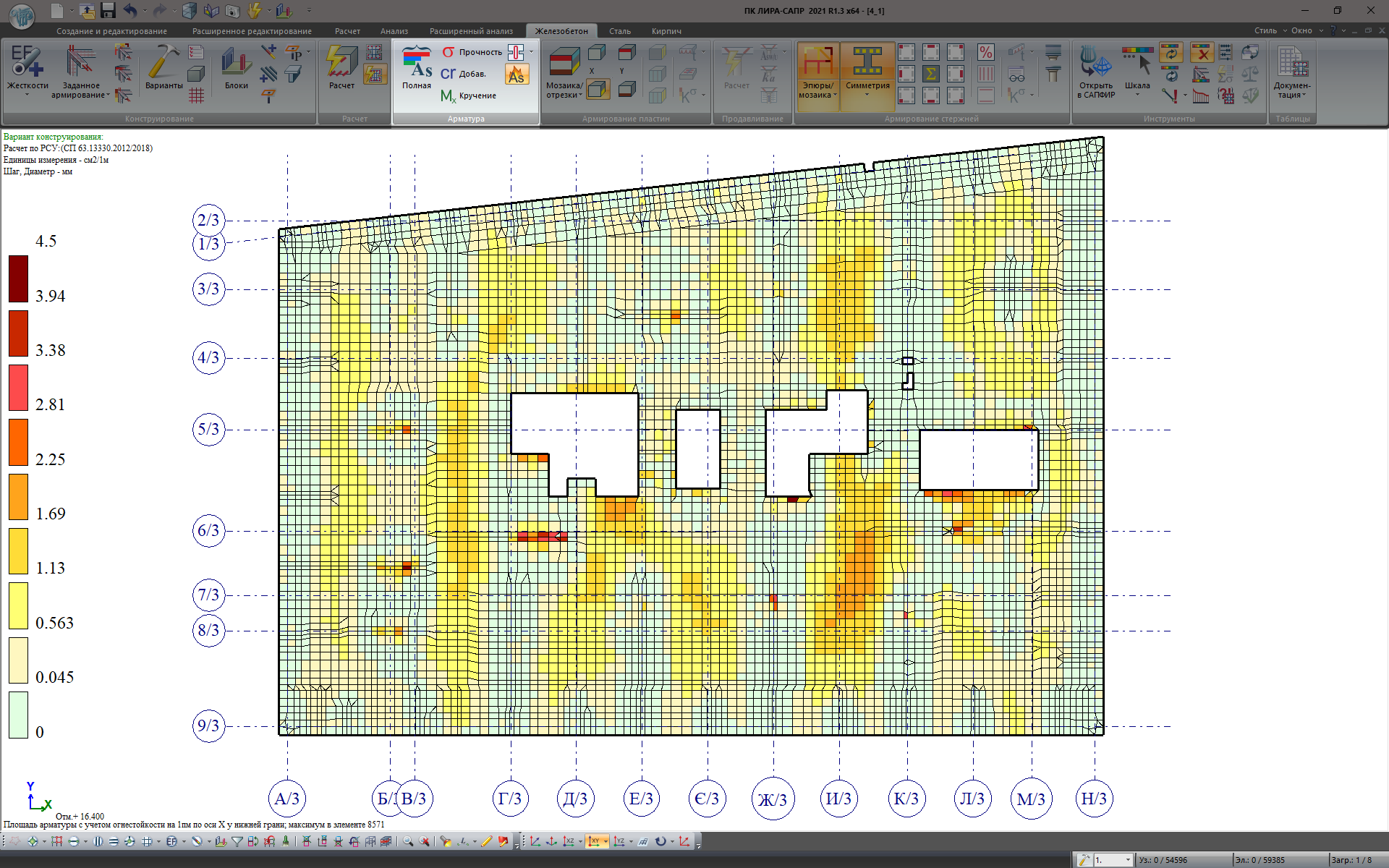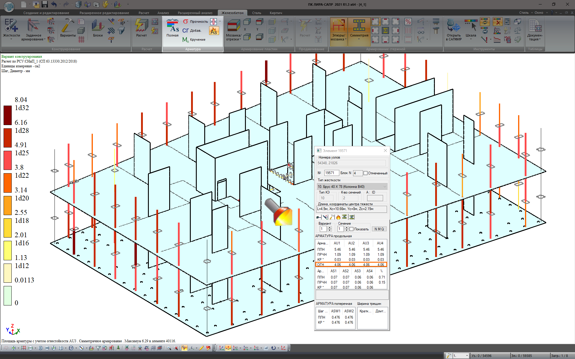 Результати підібраної арматури вогнестійкості представлені у графічному вигляді – мозаїки армування для пластинчастих і стержневих елементів схеми. А також підібрана від розрахунку на вогнестійкість арматура представлена окремим рядком у таблицях результатів і в діалоговому вікні Інформація про елемент.