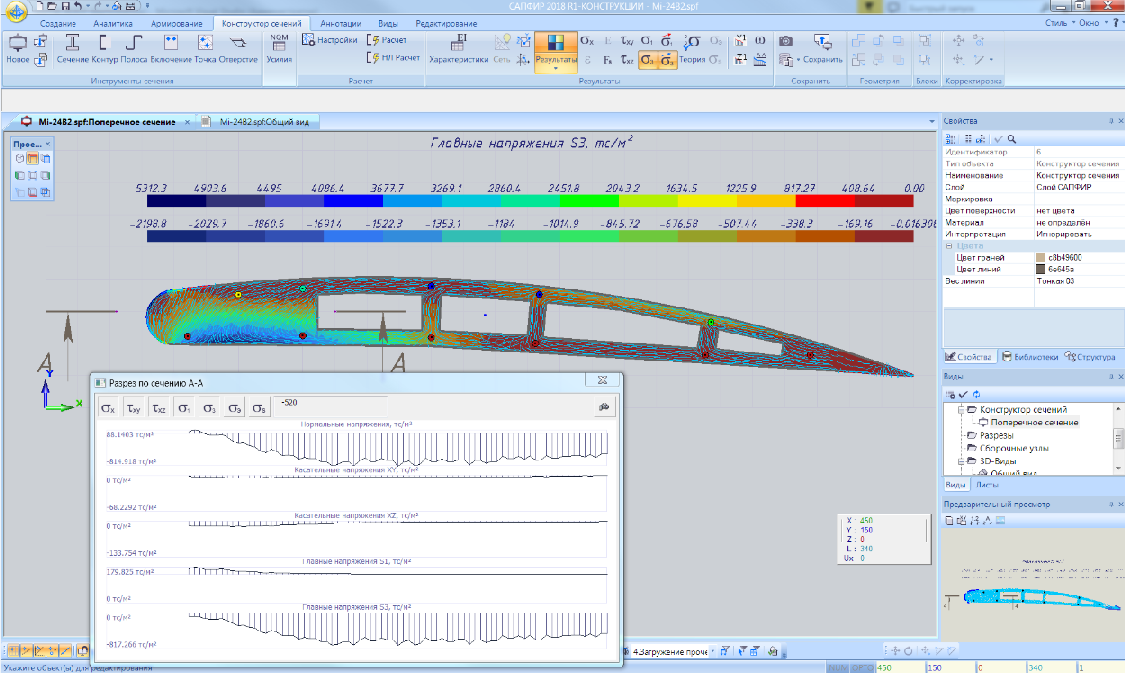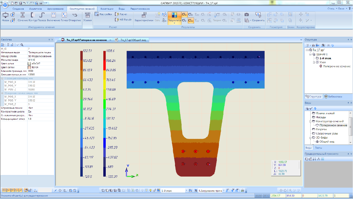 Надається можливість побудови епюр по тонкостінних частинах перерізу або по розрізу масивного перерізу. Виконується обчислення та відображення головних напружень, а також еквівалентних напружень відповідно до вибраної теорії міцності. Відображення НДС супроводжується колірною шкалою, яка дає уявлення про діапазон відображуваних значень. При наявності двох матеріалів, які сильно розрізняються за модулем деформації, надається можливість працювати з двома шкалами.