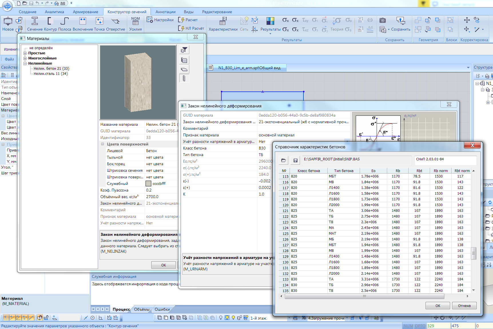 - задавати закони нелінійного деформування бетонів різних марок та арматурних сталей відповідно до СП 63.13330.2012, СНиП 2.03.01-84* та Євродкод 2;