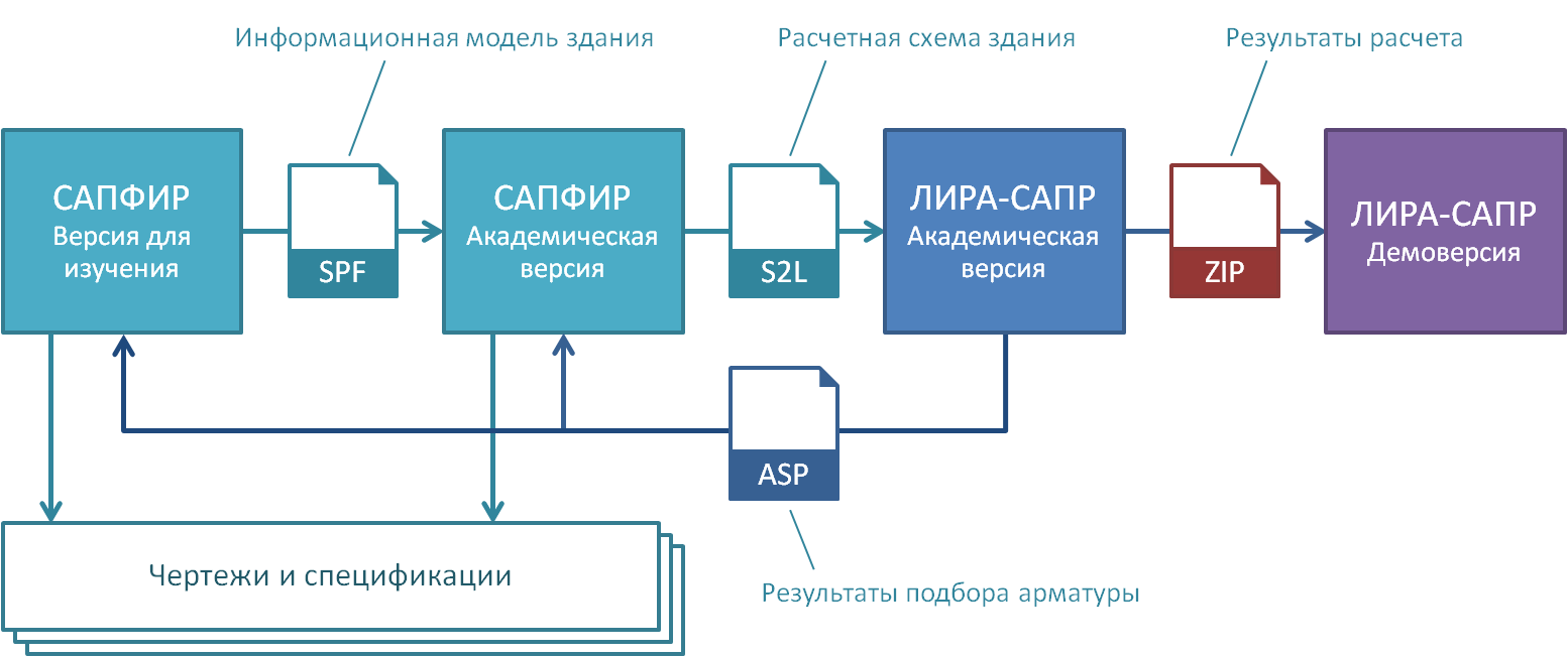 Демоверсія ПК ЛІРА-САПР включає в себе «САПФІР версія для вивчення». У цій версії поза навчальним класом, без ключа, можна створити повноцінну розрахункову схему (із заданими навантаженнями, розкладеними по завантаженнях, тріангуляцією і т.п.). Файл задачі, створений у цій версії, можна передати в систему ВІЗОР-САПР навчальної версії (Academic SET), доповнити параметричними таблицями (РСP/динаміка/збір мас) і зробити розрахунок. Збережені вихідні дані (розрахункова схема у форматі «lir») та результати розрахунку (в тому числі експорт підібраного армування для САПФІР-ЗБК) забираємо додому, переглядаємо результати в демоверсії ЛІРА-САПР, а оформлення креслень армування виконуємо в САПФІР-ЗБК версії для вивчення. Тобто аналіз, оформлення результатів розрахунку і випуск креслень КЗ і КЗВ можна також виконувати вдома. Архівація всіх даних для перенесення на інший комп'ютер і в демоверсію описана далі. Таким чином, час необхідного перебування в комп'ютерному класі ВНЗ зводиться до мінімуму.