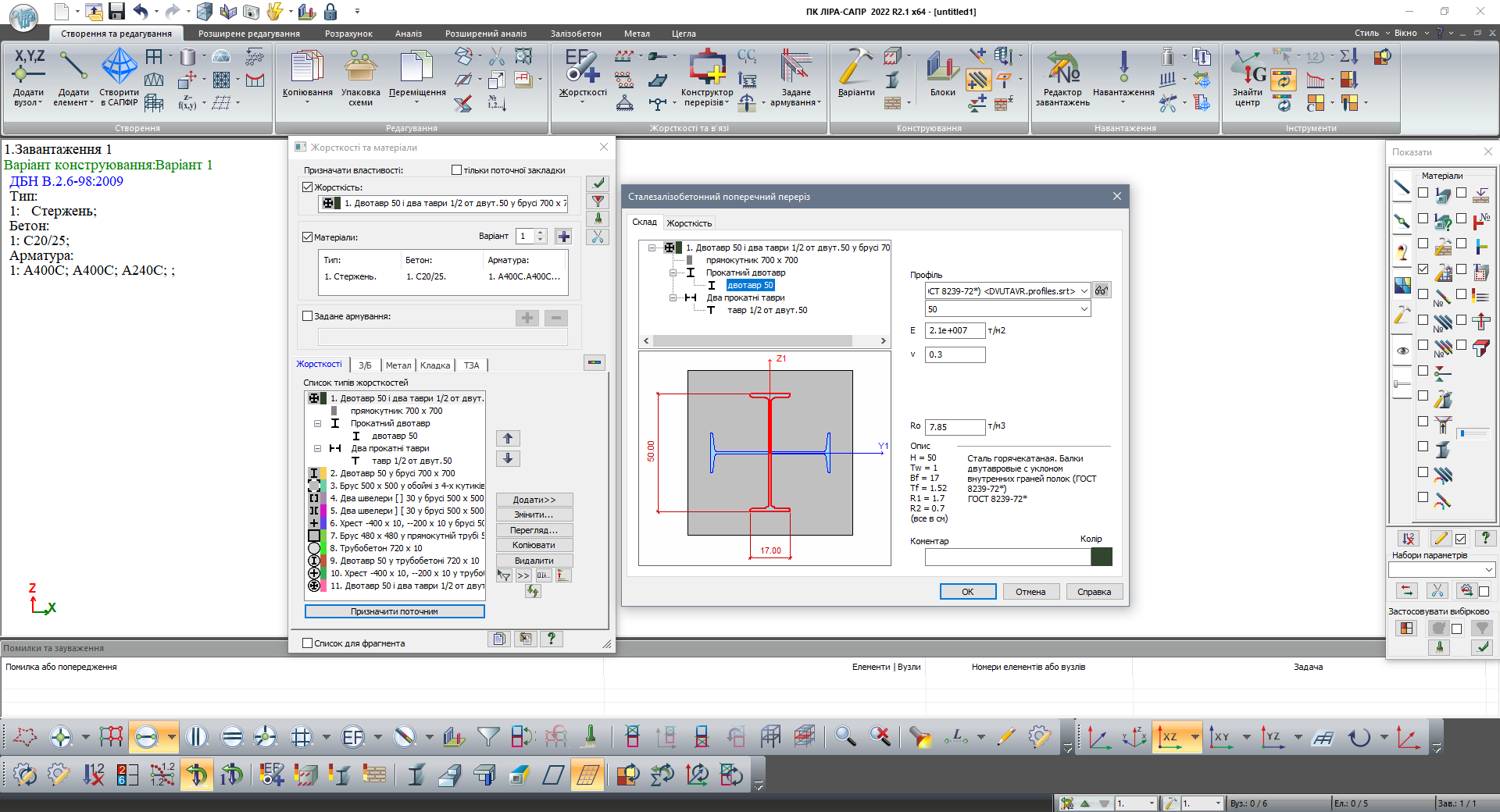 - Далі необхідно задати розрахункові характеристики а також параметри бетону та арматури, у тому числі жорсткої арматури;