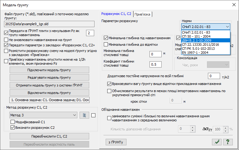 Розрахунок осідання грунтової основи та несної здатності пальової основи, розрахунок основи споруд, що зводяться на просідаючих, набухаючих, засолених, органічних та насипних ґрунтах, розрахунок основи споруд з визначенням деформацій за рахунок консолідації та повзучості ґрунтів за ДБН в LIRA-FEM виконується відповідно до вимог: