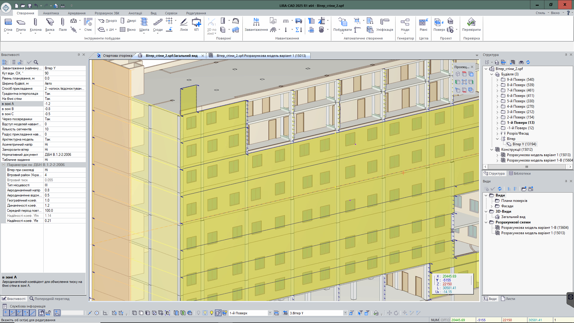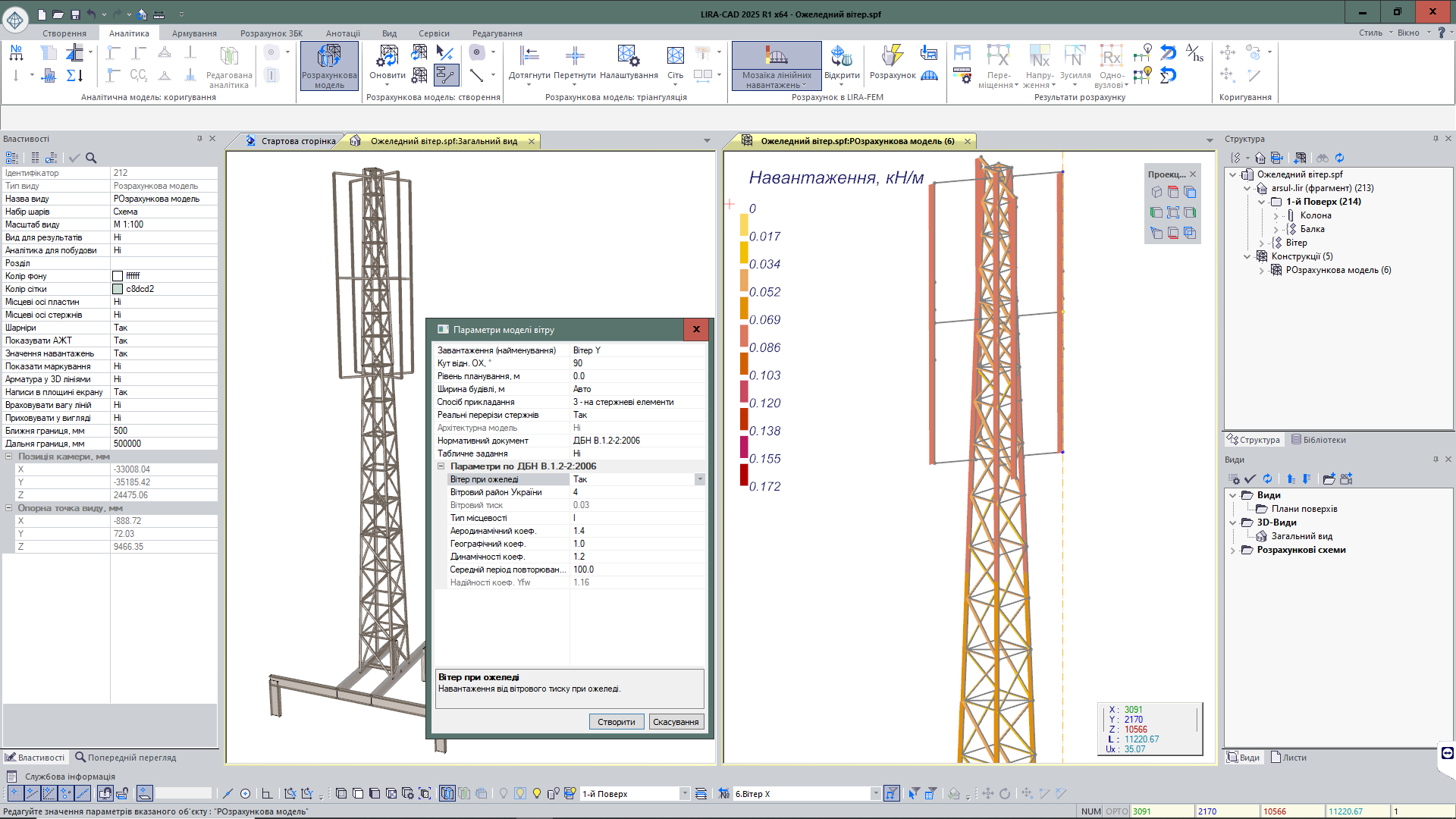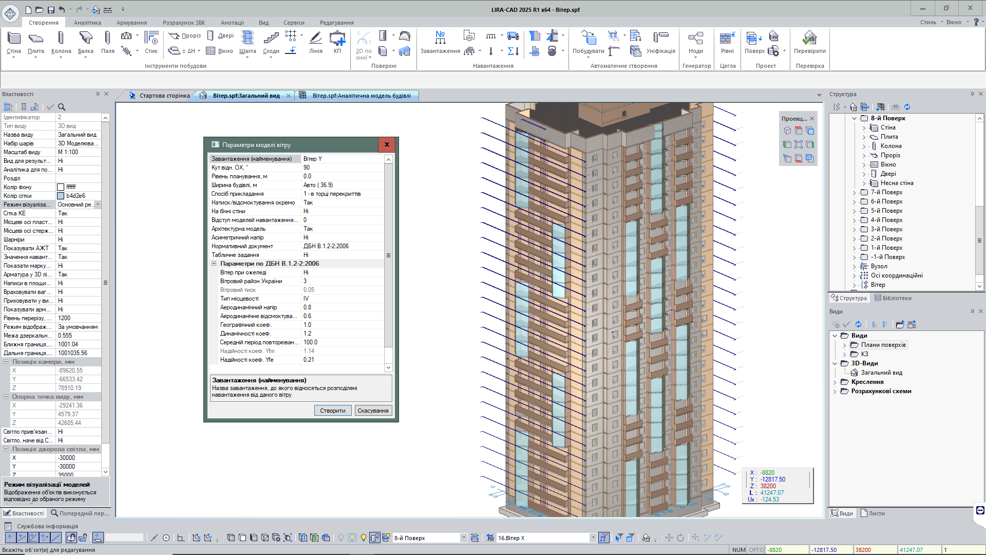 У системі LIRA-CAD автоматизоване збирання вітрового навантаження відповідно до ДБН В.1.2-2:2006. Величина навантаження визначається з урахуванням вітрового району, типу місцевості і заданих коефіцієнтів. Нерівномірний розподіл навантаження уздовж висоти споруди також береться до уваги.