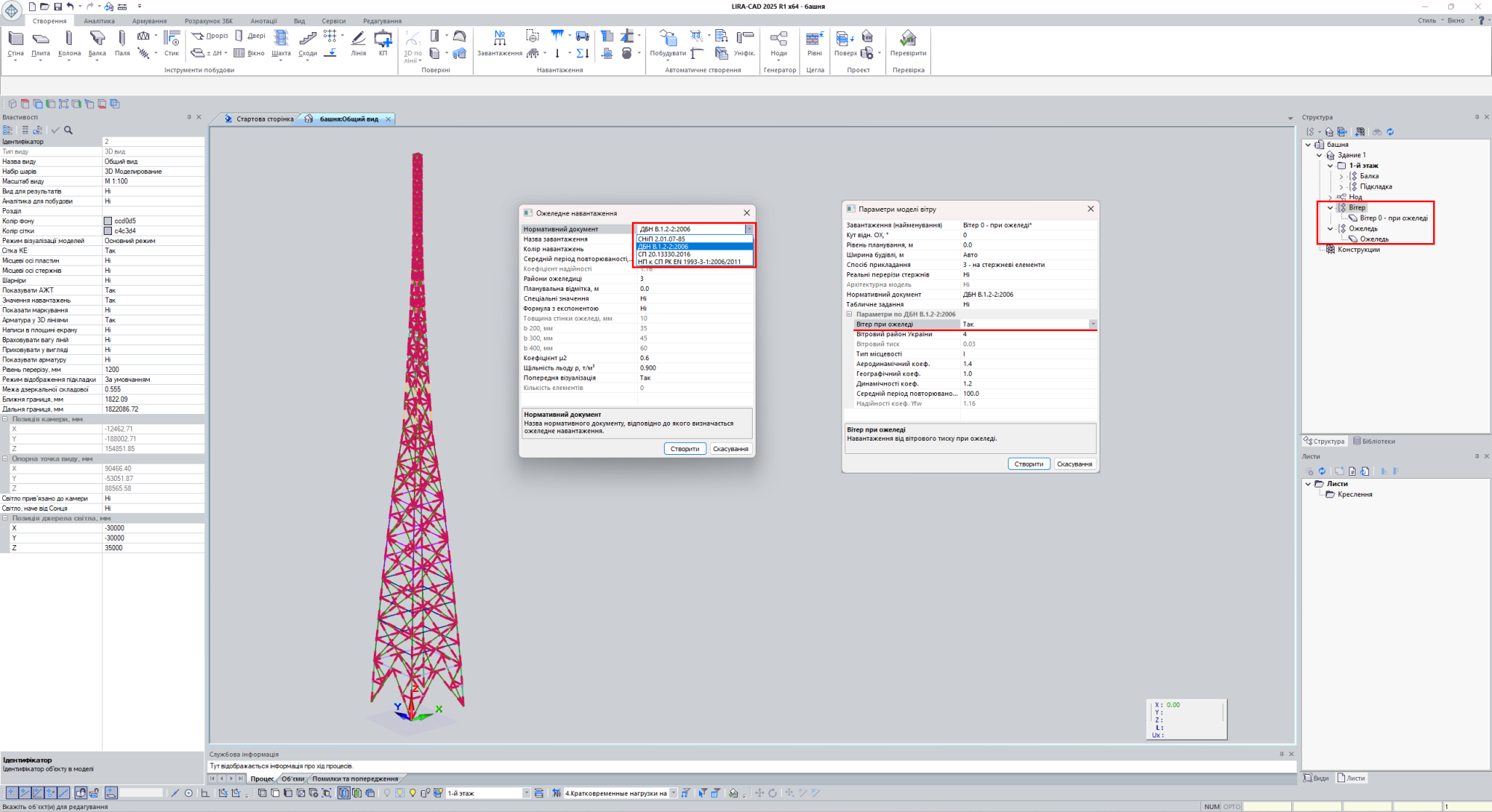 У системі LIRA-CAD автоматизовано процес збирання ожеледного навантаження відповідно до вимог ДБН В.1.2-2:2006. Навантаження розраховується з урахуванням ключових параметрів: ожеледного району (який визначає товщину стінки ожеледі на висотах 10, 200, 300 і 400 м), типу місцевості, а також співвідношення площі поверхні елемента, підданої ожеледі, до його повної поверхні.