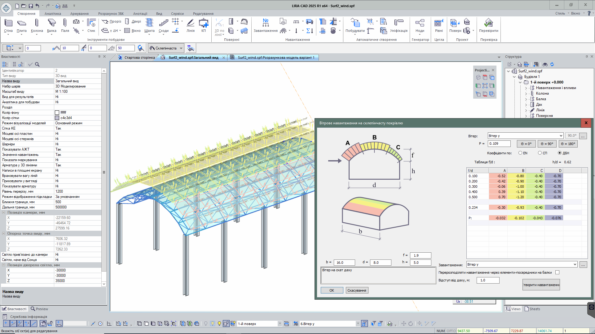 У деяких випадках значення цих навантажень не вказані безпосередньо в нормативній документації, а є похідними величинами, що залежать від багатьох параметрів (кліматичний район, співвідношення габаритів споруди, висота прикладання навантаження та інші). Для автоматизації обчислень та призначення таких навантажень згідно з ДБН В.1.2-2:2006 у LIRA-CAD впроваджено низку зручних функцій, що значно спрощують цей процес.