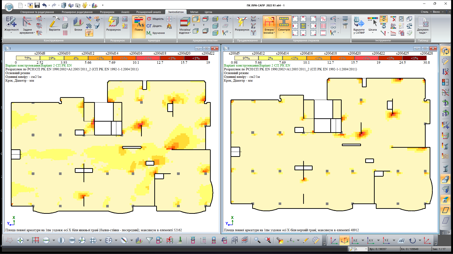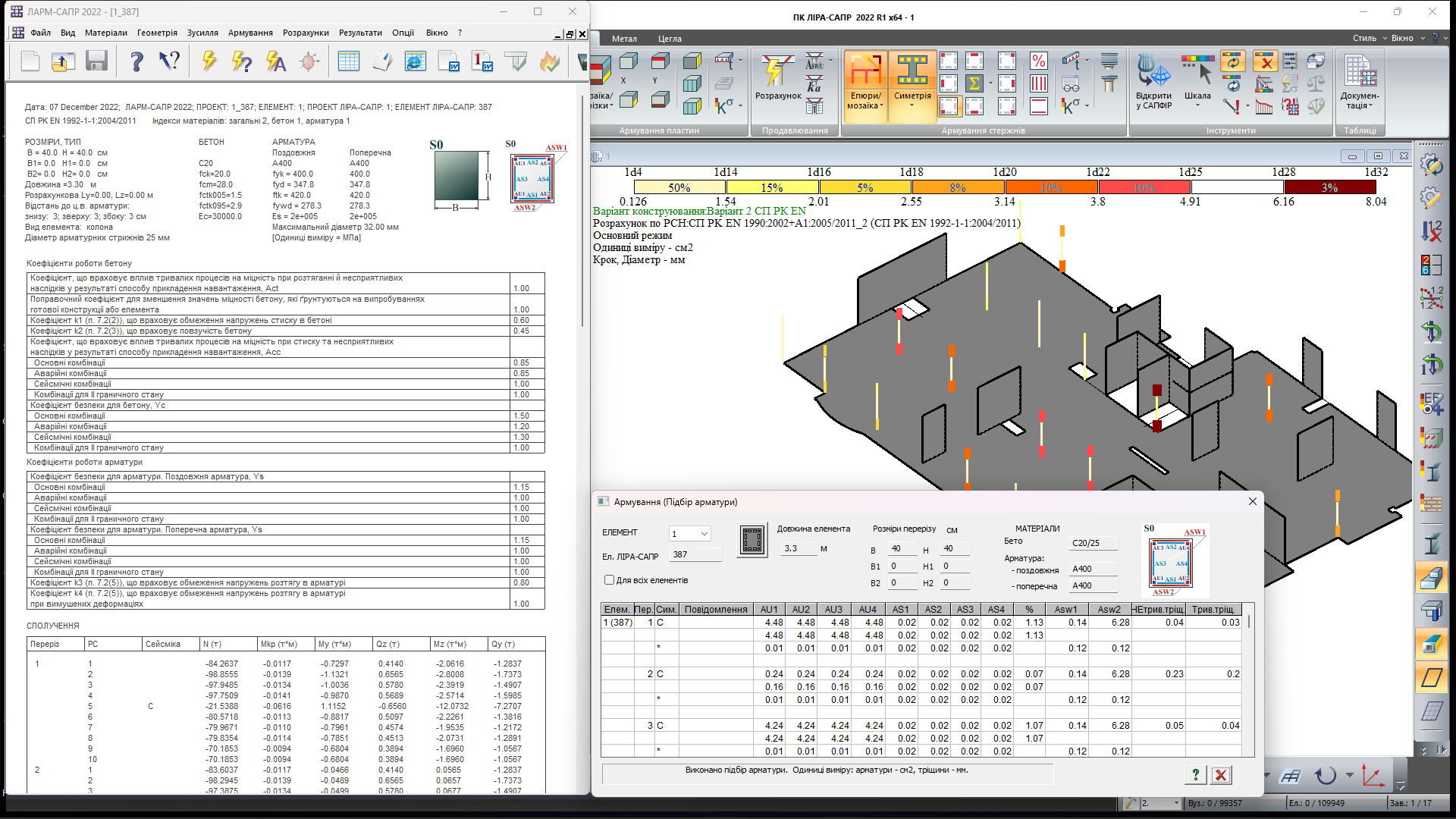 У LIRA-FEM (ЛІРА-САПР) реалізовано розрахунок залізобетонних конструкцій, підбір та перевірка заданого армування у колонах, балках, плитах, стінах відповідно до вимог Єврокод: