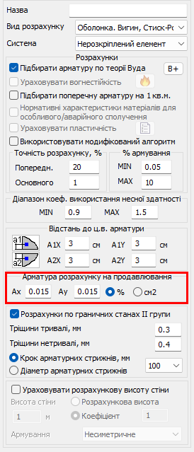 Окремо можна включити або вимкнути ознаку розрахунку армування з розкриття тріщин. Задається граничне значення ширини розкриття тріщин та діаметр арматури для розрахунку ширини розкриття тріщин.