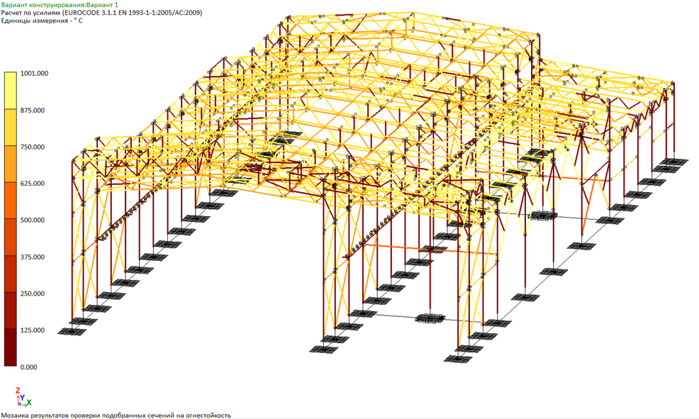В програмному комплексі LIRA-FEM реалізовано розрахунок на вогнестійкість сталевих конструкцій за рекомендаціями EN 1993-1-2:2005. Виконується розрахунок критичної температури, а динаміка зменшення несучої здатності елемента в залежності від збільшення температури (повний звіт) доступний у локальному режимі розрахунку конструктивного елемента СТК.